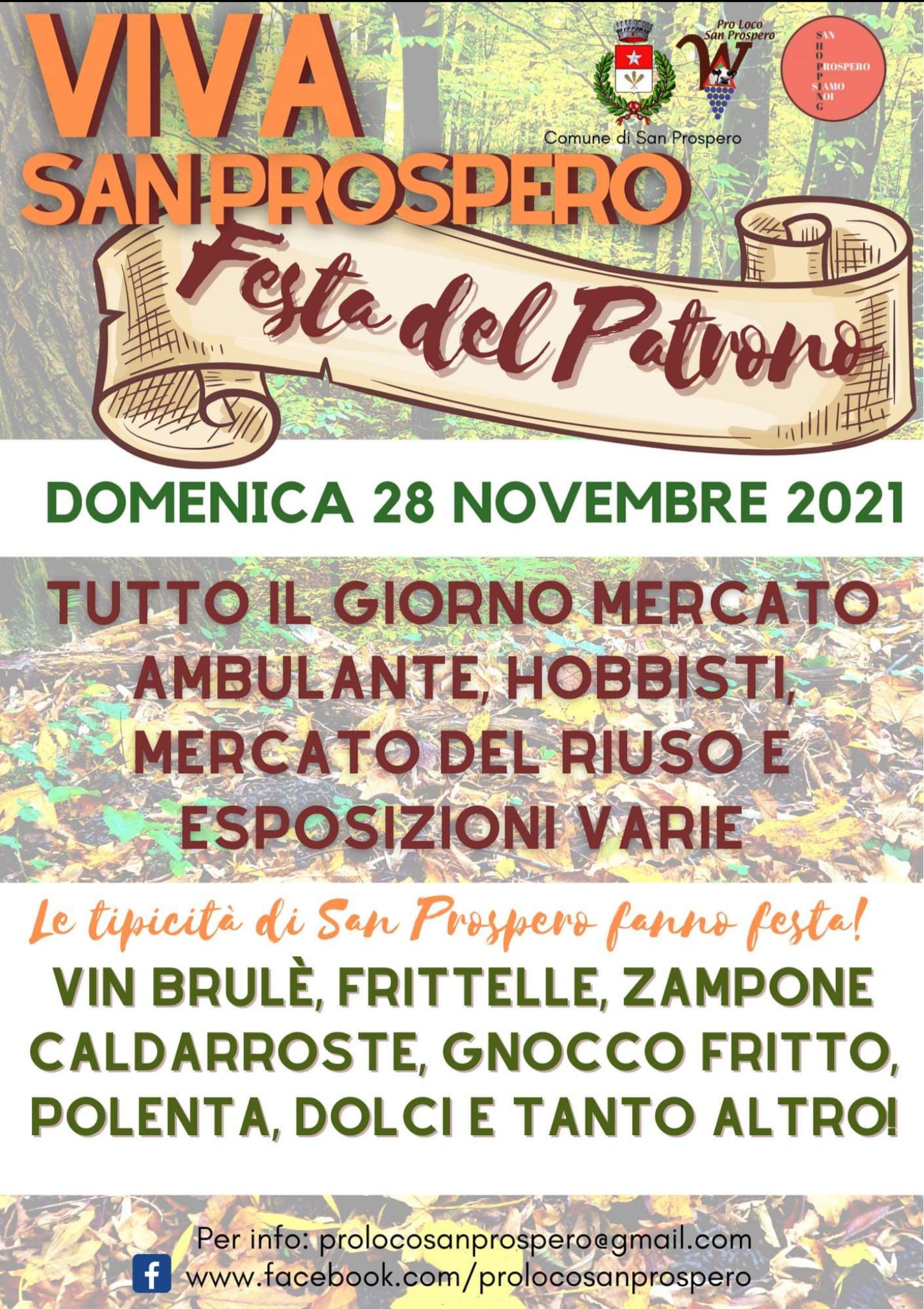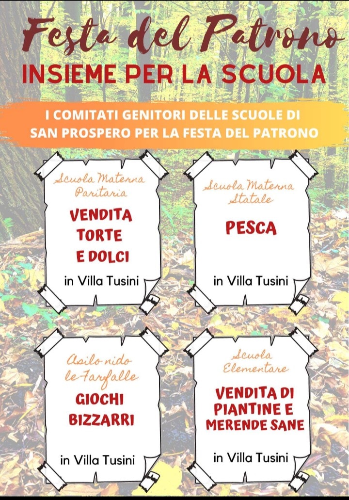Domenica 28 novembre ritorna la Festa del Patrono a San Prospero. Per tutta la giornata il centro del paese, partendo da Via Canaletto fino a Villa Tusini, diventerà sede di mercatini, ambulanti e hobbisti, stand gastronomici, mostre, esposizioni e un’area dedicata ai bambini e alle scuole, organizzata dai comitati dei genitori. La manifestazione è organizzata dalla Pro Loco San Prospero in collaborazione con le associazioni di volontariato, i commercianti, i comitati genitori delle scuole ed è patrocinata dal Comune di San Prospero.