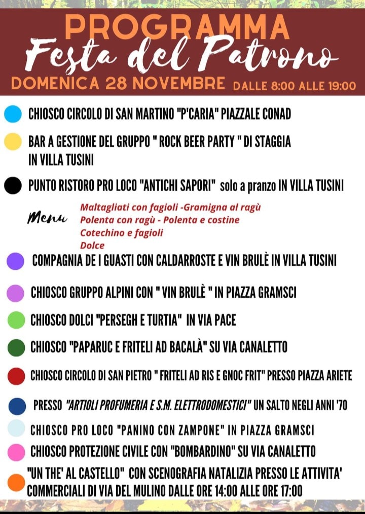 Tra le specialità che si potranno gustare nel corso dell’iniziativa, frittelle di riso e di baccalà, gnocco fritto, vin brulè, caldarroste, dolci, zampone e tanti altri prodotti tipici del territorio preparati dalle associazioni di volontariato. Per l’occasione anche i ristoranti del territorio proporranno menù dedicati al Patrono e alle eccellenze enogastronomiche locali.