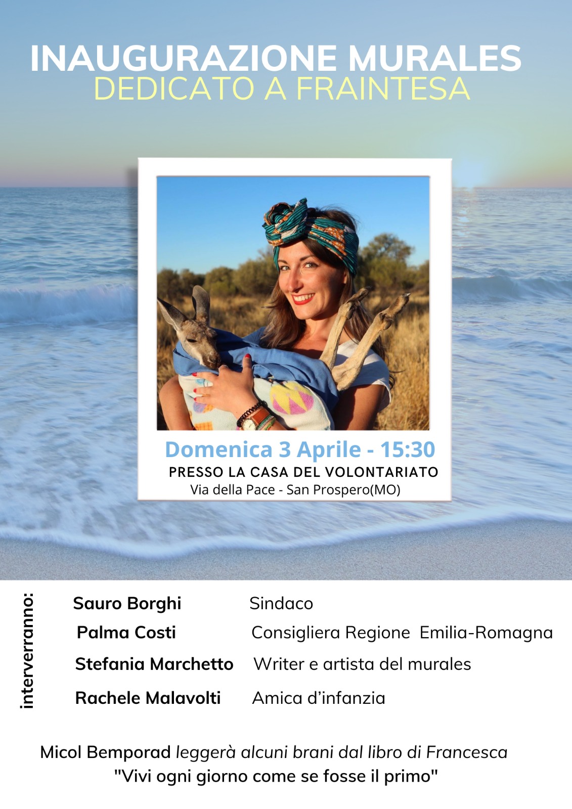 Domenica 3 aprile alle ore 15.30, presso la Casa del Volontariato di San Prospero (Via della Pace), si terrà l’inaugurazione del murales dedicato a Francesca Barbieri, la blogger “Fraintesa” prematuramente scomparsa lo scorso anno. Autrice del murales è l’artista Stefania Marchetto, già creatrice del murales di Milano dedicato a Francesca Barbieri. Alla cerimonia saranno presenti il Sindaco di San Prospero Sauro Borghi, il Consigliere della Regione Emilia-Romagna Palma Costi, l’amica d’infanzia Rachele Malavolti e la stessa Stefania Marchetto. Micol Bemporad leggerà alcuni brani dal libro di Francesca Barbieri “Vivi ogni giorno come se fosse il primo”. La cittadinanza è invitata a partecipare.