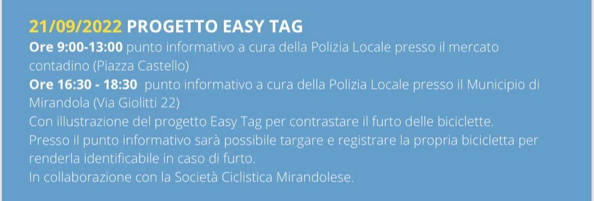 Mirandola si conferma Città sempre più ciclabile e attenta alla sicurezza. L’Amministrazione, per contrastare i furti di biciclette e monopattini, ha scelto di adottare un sistema di marcatura – denominato “Easy TAG” – che avrà il compito di sconfortare i furti, facilitando contestualmente l’attività delle forze dell’ordine nel tracciamento e, nei casi di ritrovamento della bicicletta o del monopattino rubati, la riconsegna al legittimo proprietario.