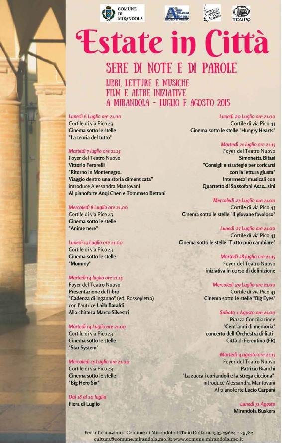 Incomincia lunedì 6 luglio il programma di eventi che il Comune di Mirandola propone per il mese di luglio e agosto.