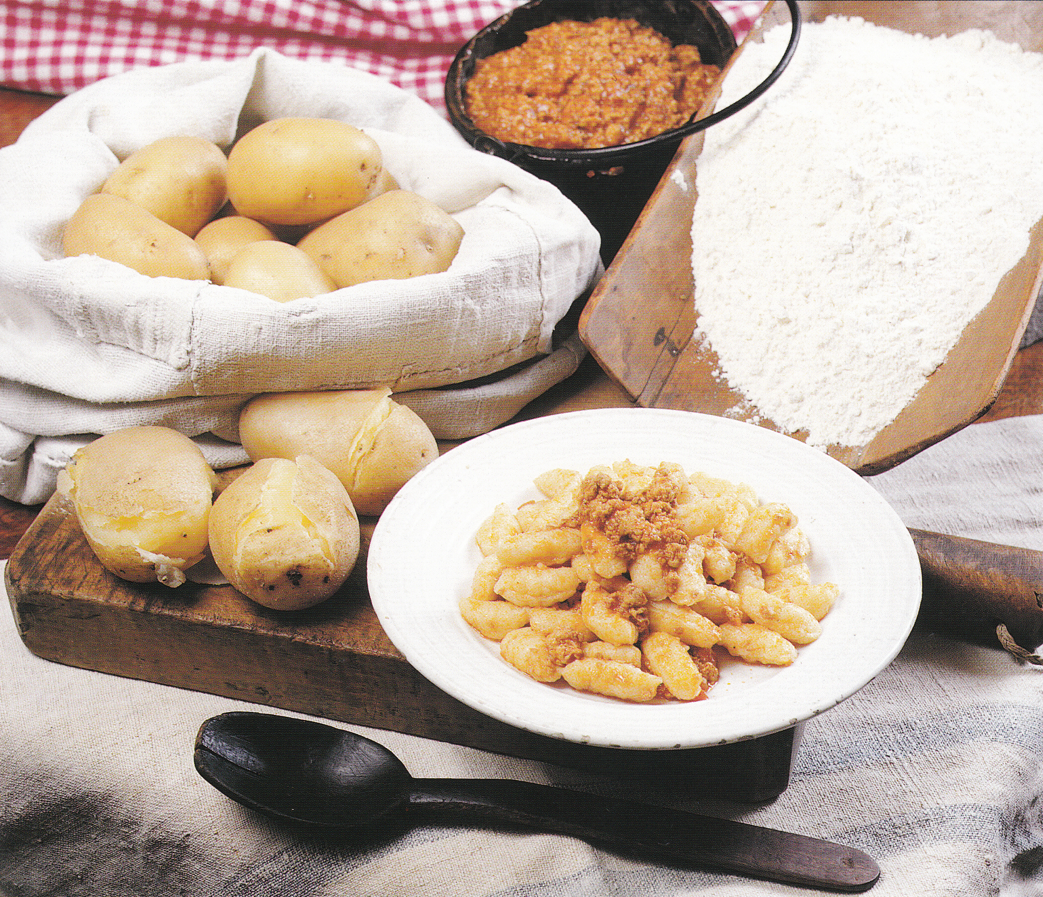 Nel mirandolese gli gnocchi di patate erano molto diffusi e costituivano un piatto assai povero ma anche tanto gradito da adulti e piccini. Erano conditi con burro fuso e Parmigiano-Reggiano stravecchio grattugiato, ma si condivano anche con un soffritto e pomodoro, e con ragù di carne, anche se quest’ultima versione che ha decisamente preso il sopravvento sulle altre è estranea alla tradizione delle minestre povere.