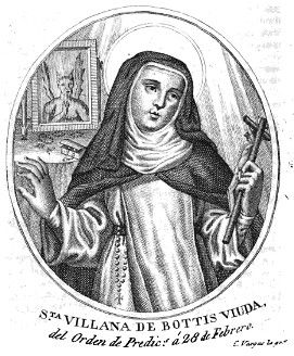 Villana de’ Botti nasce a Firenze nel 1332 da una ricca famiglia di mercanti. Nel periodo della sua giovinezza a Firenze accadde di tutto; grossi fallimenti bancari, inondazioni, la cacciata del tiranno il duca di Atene e la terribile peste nera. I fiorentini reagirono in due modi, chi si rivolse alla religione ed alla preghiera e chi preferì darsi ai piaceri ed alla dissolutezza. Villana fece parte del secondo mondo e non pensò ad altro che agghindarsi e farsi bella e a divertirsi, senza cambiare nemmeno dopo il matrimonio con un ricco concittadino. Un giorno, mentre s’imbellettava davanti allo specchio, questi le rimandò un’immagine di lei mostruosa. Villana capì l’avvertimento ed uscì di casa senza agghindarsi ed andò a s. Maria Novella dove fece la confessione generale: uscì di chiesa trasformata. Da allora visse solo per fare del bene. Fu terziaria domenicana, mendicò per i poveri e vendette tutti i suoi beni. Convertì il padre caduto in miseria e convinse il marito incredulo. Accettò con serenità la malattia e morì ancor giovane nel 1360. In s. Maria Novella si può ammirare la sua bella tomba.