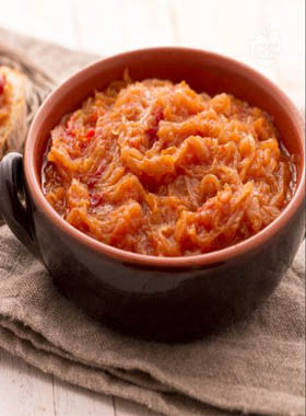 pelare le cipolle, affettarle sottilmente, condirle con lo zucchero e il sale grosso e metterle a macerare da due a quattro ore. Coprire il recipiente dove si lasciano macerare le cipolle. Trascorso il tempo mettere le cipolle con la loro acqua e lo strutto in un capace tegame e fare cuocere, a fuoco molto lento, mescolando di frequente fino a quando le cipolle diventano di un bel colore biondo molto scuro. Se tendono ad attaccarsi aggiungere un po’ di acqua. Unire i pomodori spezzettati e continuare la cottura ancora per un paio d’ore, sempre a fuoco moderato e sempre mescolando di frequente.