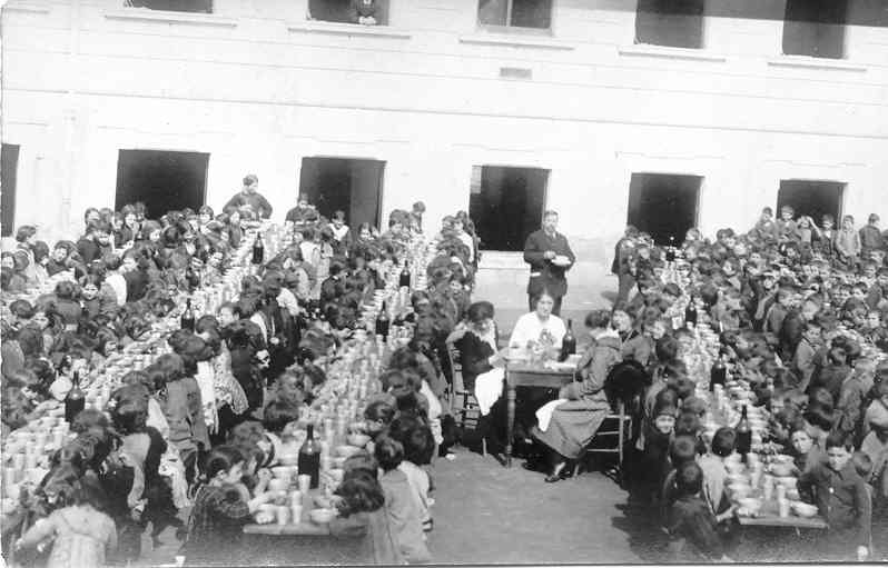 Molti bambini che frequentavano la scuola erano poveri ed era pertanto necessario dare loro la refezione. Per questo nel sotterraneo furono costruiti due refettori, divisi e distinti per i maschi e per le femmine, nei medesimi luoghi in cui si trovano anche attualmente. In essi erano collocati lunghi tavoloni con panche. Le stoviglie erano in alluminio. Dove ora c’è l’atrio centrale era stata installata una grande cucina con una imponente stufa a legna in cui venivano cucinati, in enormi pentoloni, i pasti. Al centro della stufa si trovava una piccola gru che serviva per sollevare i pentoloni troppo pesanti per le braccia delle cuoche.