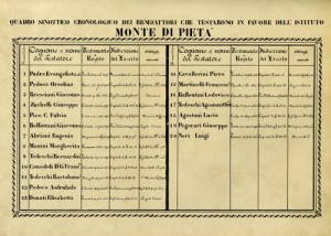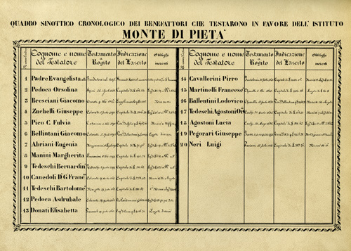 All’inizio venne richiesto un piccolissimo interesse, 1 danarino al mese per ogni lira prestata, ma un centinaio di anni dopo, nel 1598, la Contessa Fulvia da Correggio lo fece eliminare portando così il Monte di Pietà della Mirandola ad essere una delle rarissime istituzioni del genere a prestare denaro in cambio del solo pegno. Nello stesso anno il Monte riceveva tramite Statuti e Capitoli rinnovati la definitiva approvazione dello Stato. Alla propria morte la Contessa lasciò gran parte dei suoi averi al Monte. Il Monte, a parte i primi 100 anni in cui prendeva un piccolo interesse sui prestiti, viveva attraverso donazioni e lasciti di facoltosi personaggi. Ci piace qui ricordarne con gratitudine alcuni di molto meritevoli: Orsolina Pedoca (deceduta nel 1548), Fulvia da Correggio (1590), Bernardino Tedeschi (1594), Bartolomeo Tedeschi (1602), Asdrubale Pedoca (1608), Ortensia Tedeschi Agostoni (1635) e Luigi Neri (1814). Queste persone lasciarono ingenti somme o immobili al Monte per puro spirito di carità cristiana. Altre molteplici piccole donazioni venivano effettuate e nelle principali chiese della Mirandola vi era una cassetta per le offerte al Monte che venivano aperte e vuotate una volta all’anno, per l’Epifania, con una piccola ma solenne cerimonia.