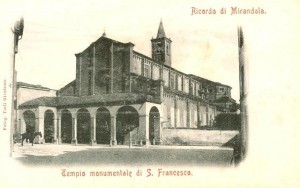 Nell’anno 1485 i francescani, conosciuti allora come “Minori Osservanti”, avevano istituito il “Desco dei poveri” sotto il porticato della chiesa di S. Francesco. Dieci anni dopo, il 4 ottobre del 1495 festa di S. Francesco, in chiesa un frate conosciuto come Evangelista da Faenza fece una predica per raccogliere fondi. Ebbe tanto successo che raccolse 1200 £ della Mirandola e il 1° dicembre si potè iniziare l’attività del Sacro Monte di Pietà i cui Capitoli (regole) furono sanzionati dall’allora Conte della Mirandola Galeotto I. Il Sacro Monte di Pietà poteva prestare denaro in cambio di un oggetto in pegno, a patto di dimostrare di essere poveri e bisognosi.