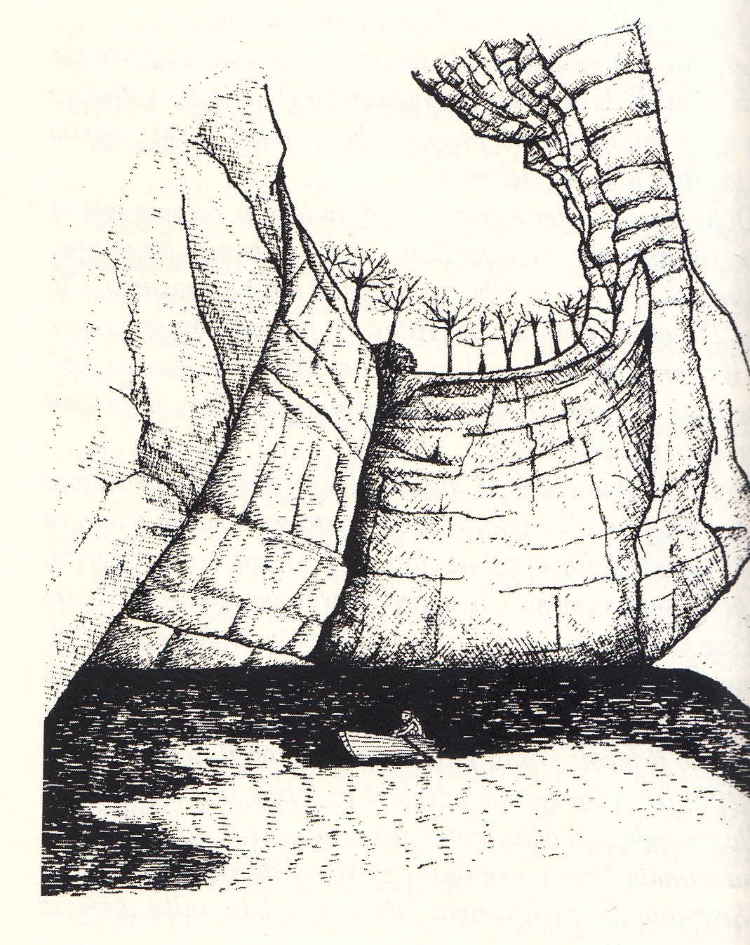 Finito il lavoro, risalì faticosamente e con il fiato mozzo la scaletta, fece nuovamente scivolare la sottile lastra di calcare nella sua sede, uscì dalla grotta, senza neanche degnare di un’ul­tima occhiata i tesori, e richiuse l’apertura, che ritornò invisibile.
