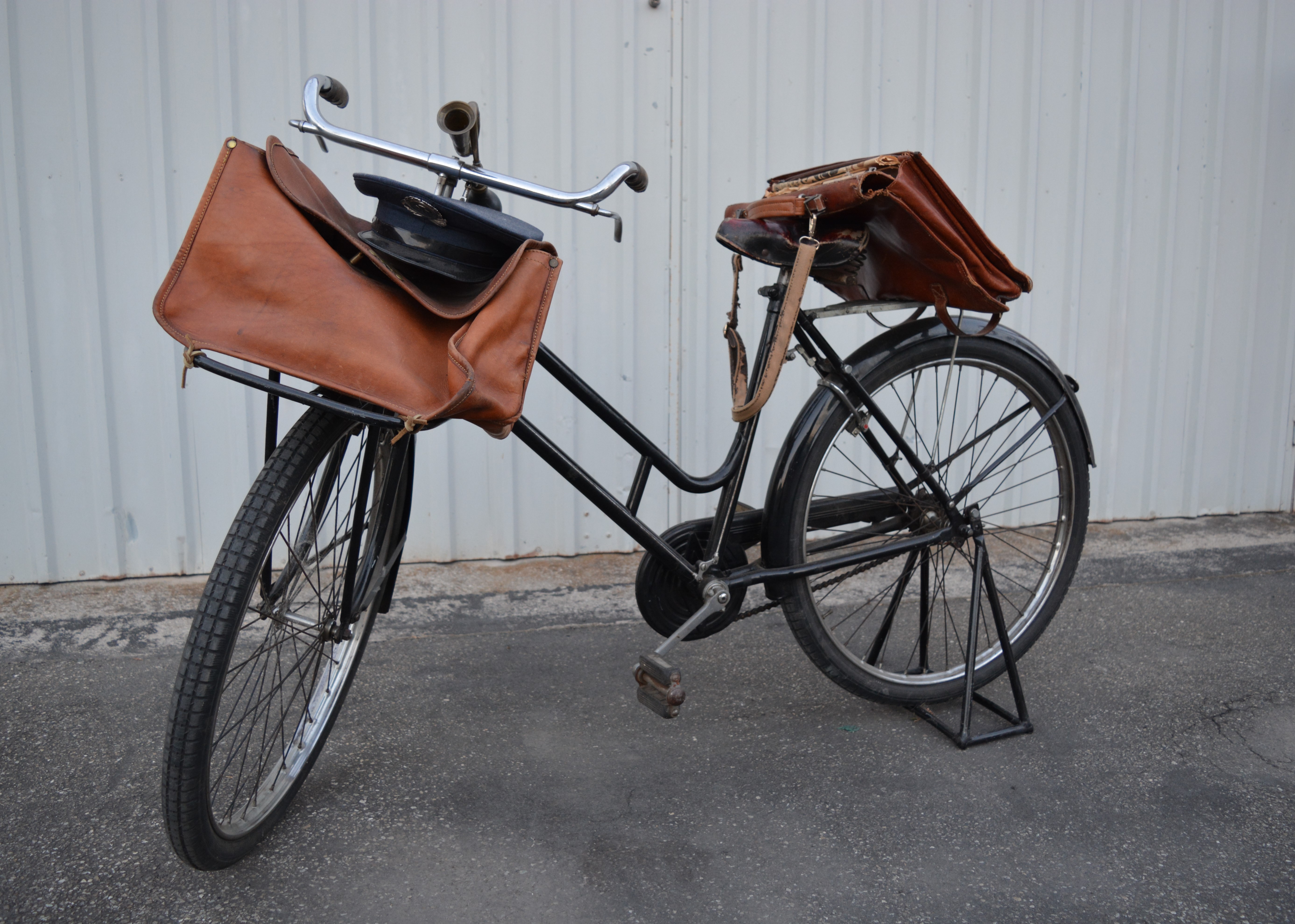 Nessuna marca, una bici artigianale, classica, assemblata su un telaio costruito a mano. Una bici con le canne ricurve per facilitare le frequenti salite e discese ma anche per alloggiare la voluminosa sacca appesa a volte all’interno del manubrio e facilitare così la ricerca delle lettere stando seduti sulla sella.