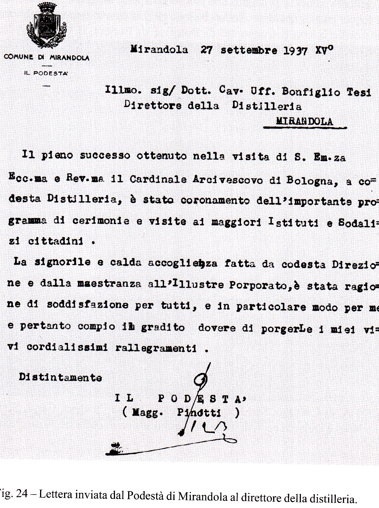 L’importanza della presenza della distilleria a Mirandola fu evidenziata con la visita effettuata il 27 settembre 1937 dall’allora Cardinale Arcivescovo di Bologna Giovanni Battista Nasalli Rocca e sottolineata dal Podestà di Mirandola Maggiore Ferruccio Pinotti nella lettera inviata al direttore della distilleria.