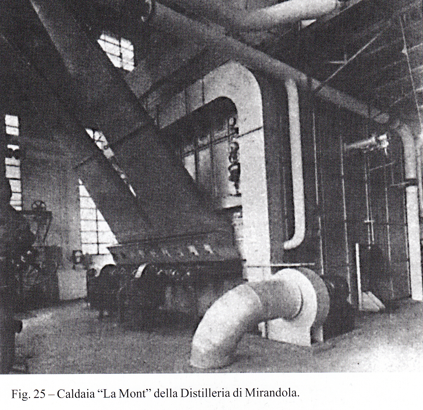 Per estrarre dalle barbabietole sugo, melasso e zucchero occorre produrre vapore e quindi la fabbrica doveva servirsi di caldaie, che all’epoca, utilizzavano come combustibile il carbone. Nei primi anni di lavorazione della Distilleria di Mirandola fece scalpore l’installazione di una caldaia “La Mont” (fig. 25), che risultava essere la prima unità di grossa potenza costruiti in Italia.