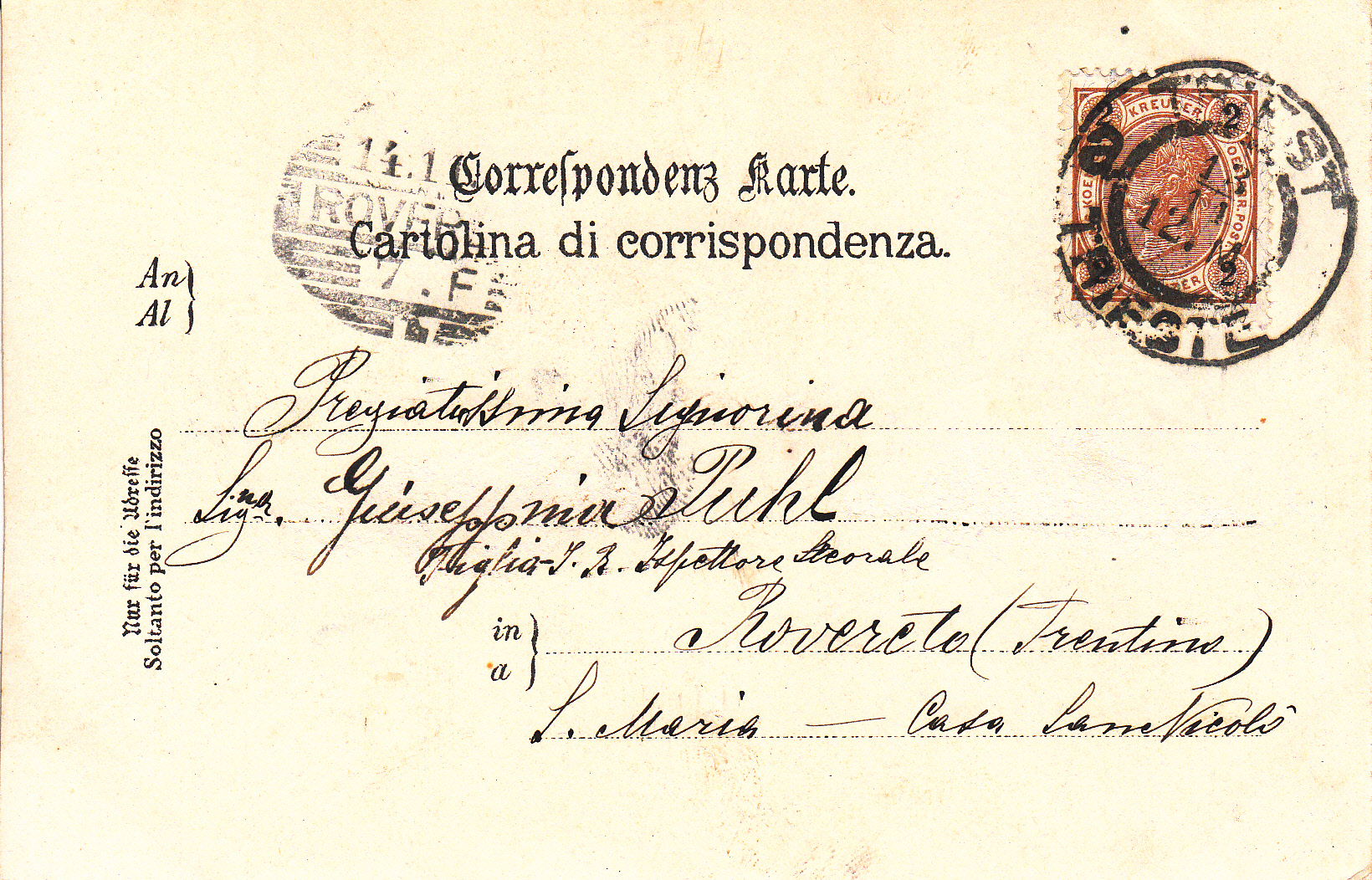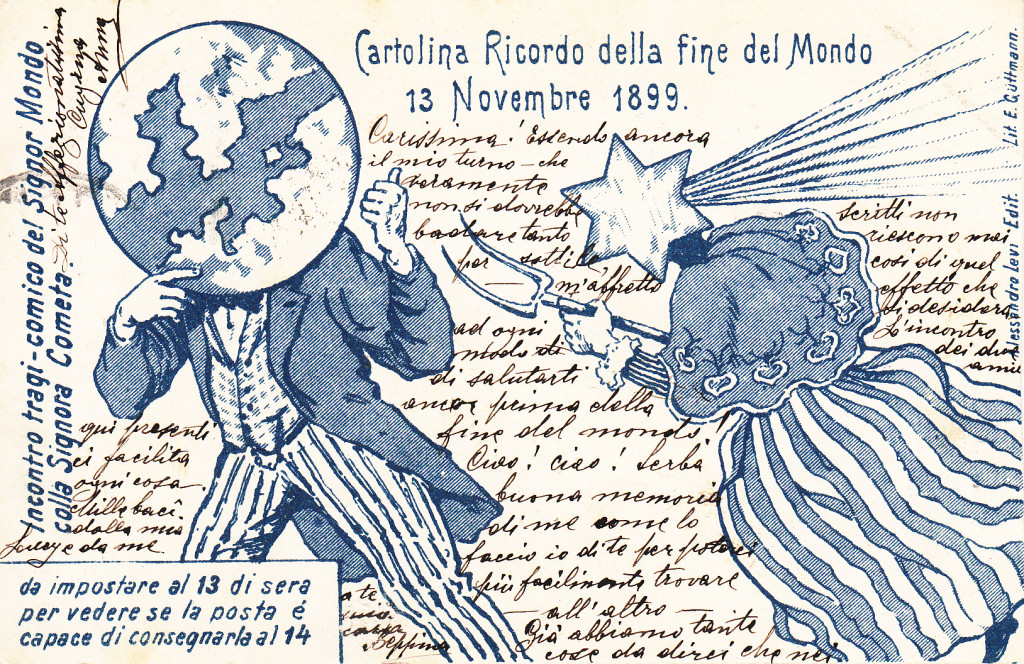 Anche il 13 novembre 1899 avrebbe dovuto essere la fatidica data per colpa di una cometa che si infrangeva contro la nostra terra. Non ci è dato sapere chi lo disse, forse il tipografo che aveva stampato la curiosa cartolina allegata. Annuncia ” Da impostare il 13 di sera per vedere se la posta è capace di consegnarla il 14″. Naturalmente la scherzosa cartolina, partita da Trieste, arrivò a destinazione proprio il 14 a Rovereto nel trentino e compaiono gli annulli ben nitidi di partenza e arrivo. Anche in quella data avvenne il miracolo : ci salvammo. Imm.1 e 2