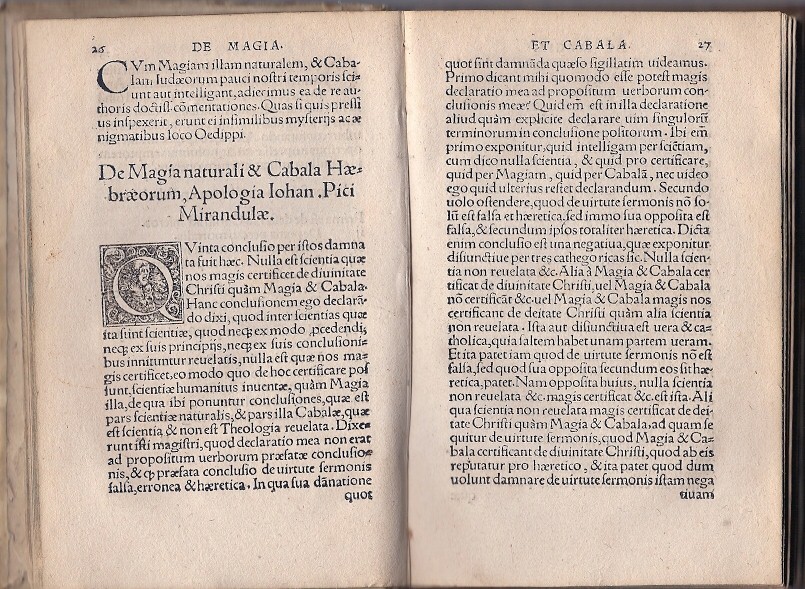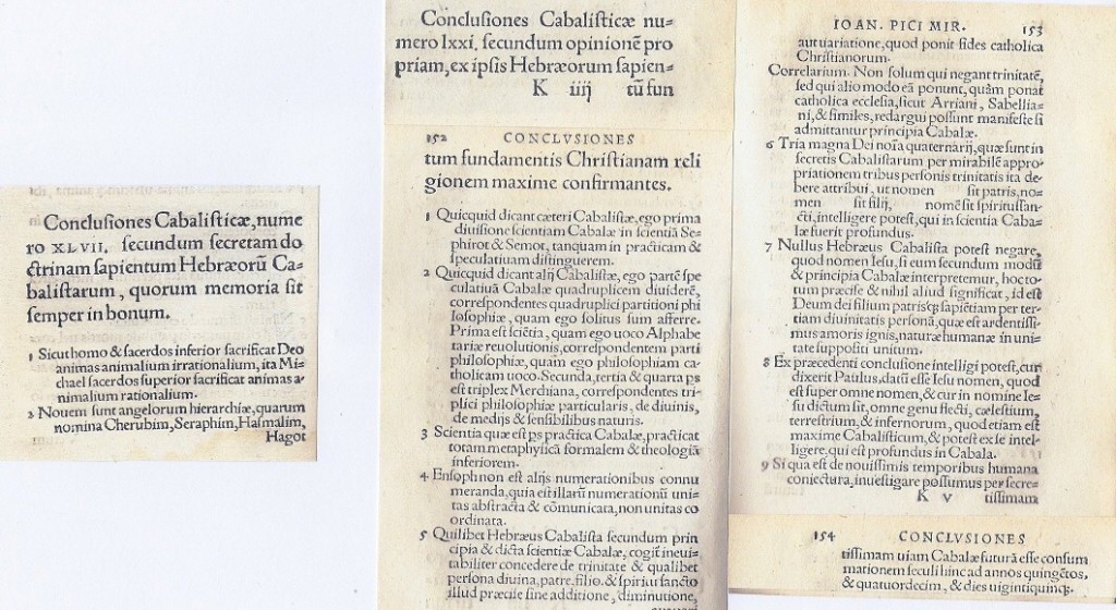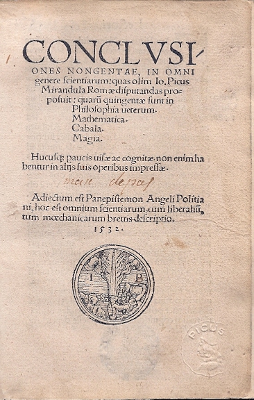 Giovanni Pico della Mirandola il 12 novembre 1486 aveva finito di elaborare le proprie 900 Tesi e aveva progettato di discuterle con chi fosse intervenuto a Roma nella Epifania dell’anno successivo. Le stesse furono stampate a Roma il 7 dicembre prima di ottenere il permesso da parte della Commissione Pontificia. 13 di queste furono dichiarate o eretiche o non cattoliche e i libri vennero quasi tutti bruciati. La disputa venne annullata e il Pico dovette fuggire in Francia.Furono poi ristampate per la prima volta solo nel 1532. Imm.4