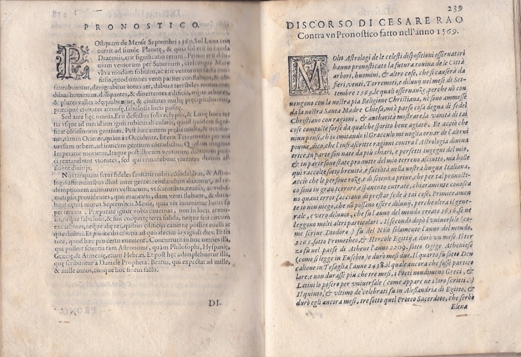 Neanche Pico ha predetto giustamente la fine del mondo. La stessa figura che fece Cesare Rao che, dibattendo con un astrologo, citò sia il Savonarola che il Pico a difesa della propria tesi. Successe che un preveggente fece uno strano “pronostico” affermando che nel 1569 ci sarebbero stati nel mondo allora conosciuto diluvi, vento e terremoti per colpa dell’allineamento di certi astri. Il Rao affermò nel rarissimo libro ” Invettive,orationi et discorsi di Cesare Rao di Alessano città di terra d’Otranto,fatte sopra diverse materie & à diversi personaggi….” (imm.5)che non sarebbe successo nulla e con un breve trattato inveì contro coloro che facevano simili previsioni assurde. Ma, quando arrivò l’anno predetto, a Napoli vi fu un grande movimento sussultorio e ondulatorio della terra e l’anno successivo lo stesso fenomeno fu riscontrato nelle terre ferraresi allora dei Duchi Estensi. Di questo avvenimento se ne è parlato a fondo in una giornata di studio svoltasi a Mirandola che riguardava i fatti successi lo scorso mese di maggio nel territorio della bassa modenese in relazione alla figura di Giovanni Pico.