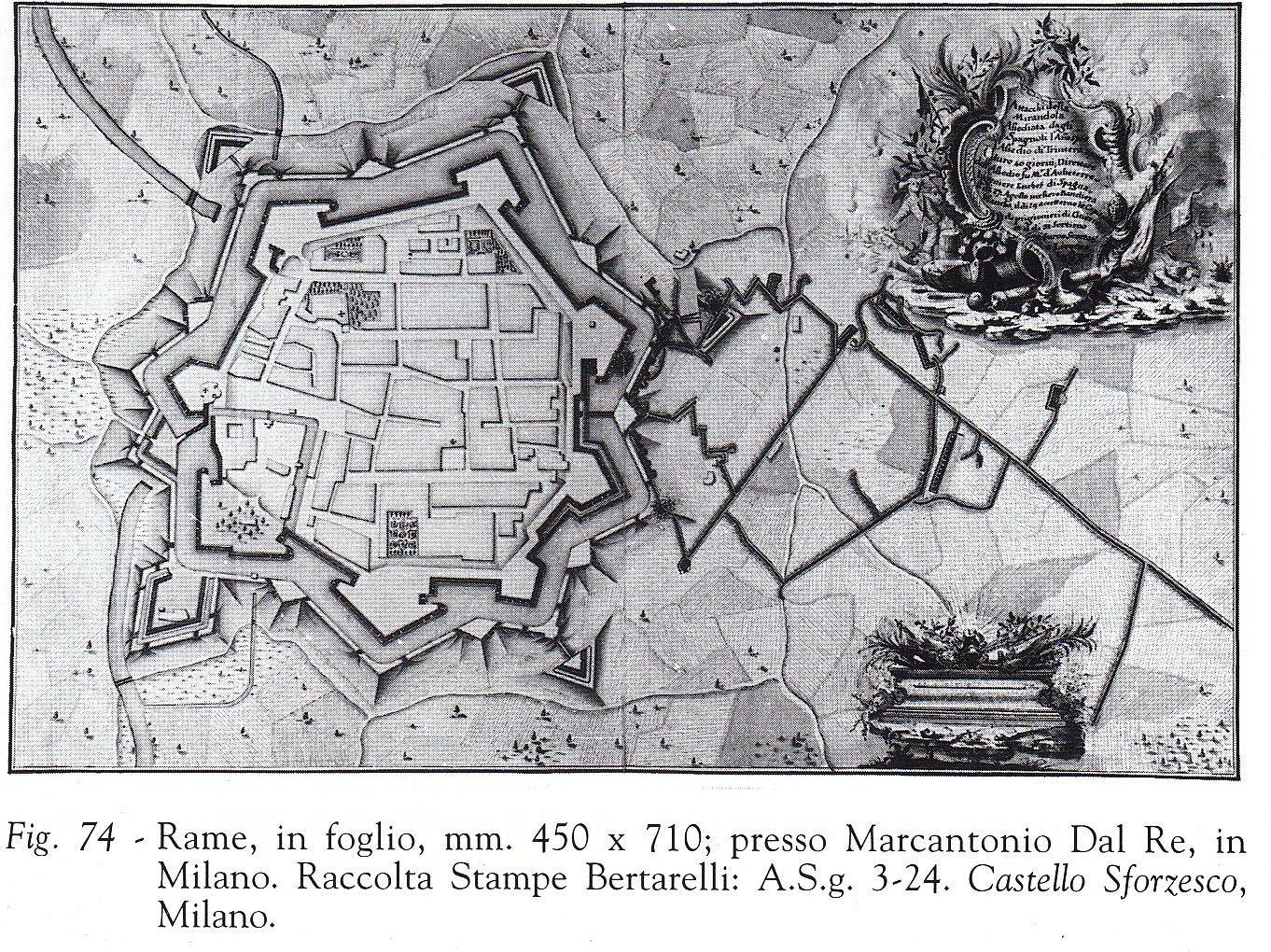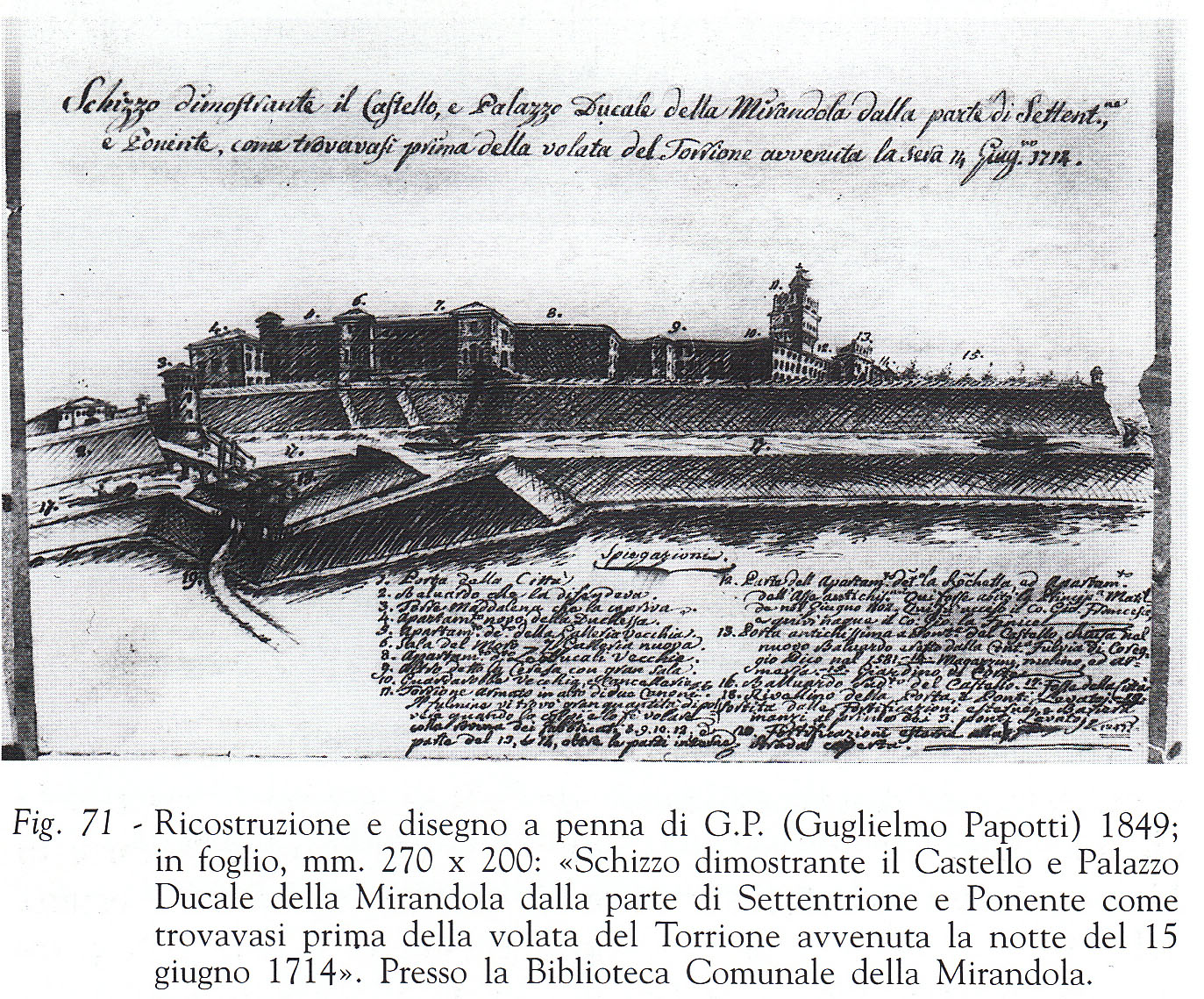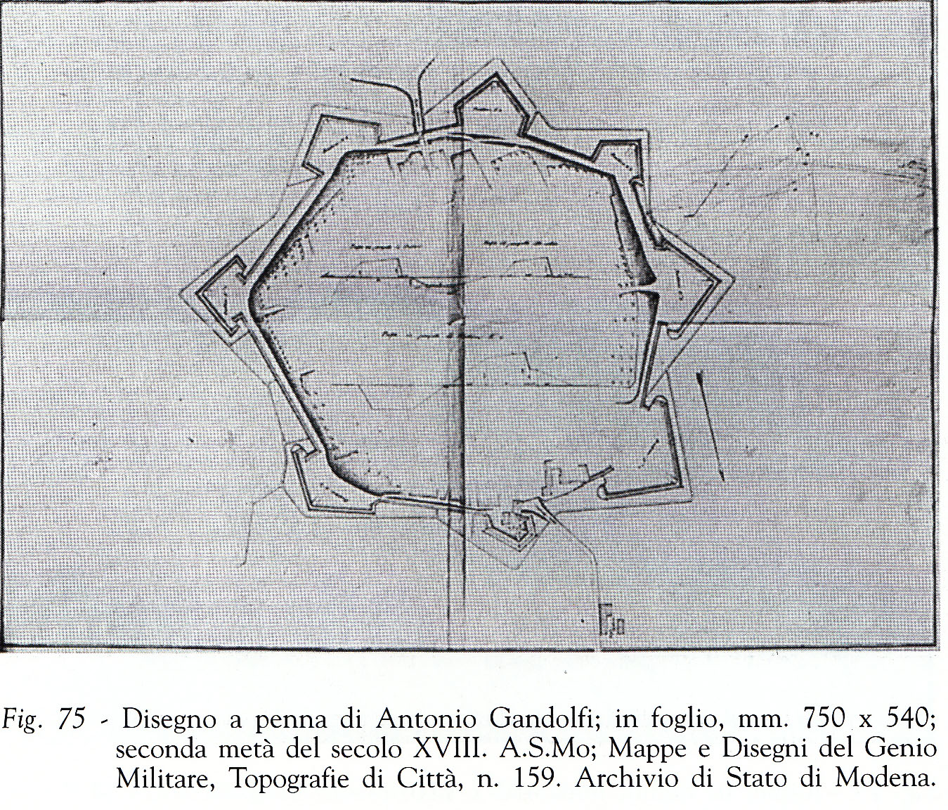 La figura riporta alcune caratteristiche della fortezza. Il disegno (che si riferisce ancora alla Guerra di Successione Polacca; si vedono gli approcci e le linee degli Spagnoli con le postazioni delle artiglierie, il «pontone» già lanciato sulla fossa per l’attacco e la breccia nel muro del bastione dei Servi) mostra il tipo di fortificazione della Mirandola cioè la città fortificata mediante la realizzazione di opere fisse (fortini avanzati) nel corpo della cinta esterna secondo gli schemi e le teorie del grande architetto ed ingegnere militare Sebastiano La Preste Marchese di Vauban.
