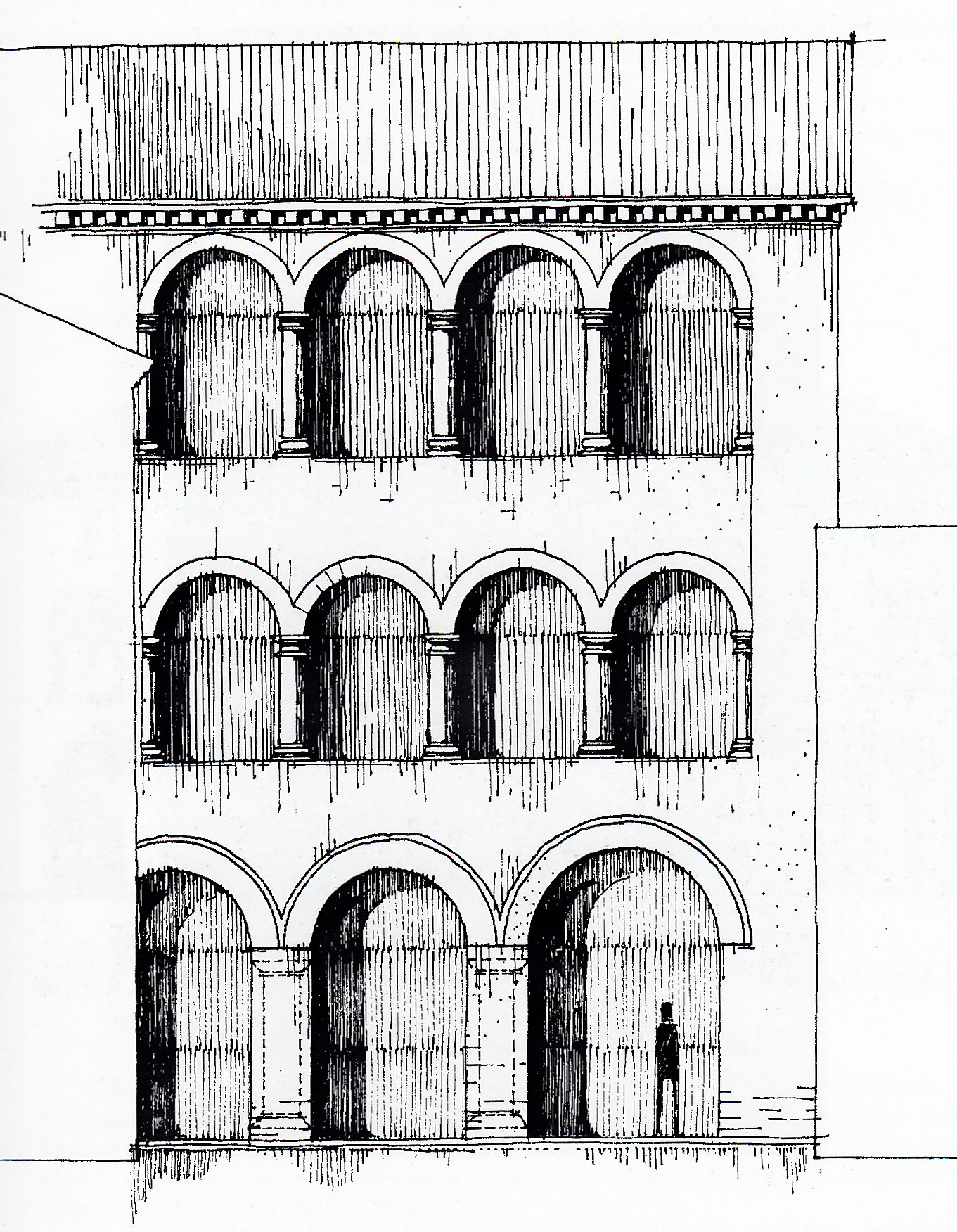 L’edificio di fatto termina incongruamente alla fine della quinta campata; nella figura, si è tentato di dare un’idea di come probabilmente, se non ci fosse stato l’ostacolo del terrapieno delle fosse del Castello, avrebbe potuto essere realizzato.