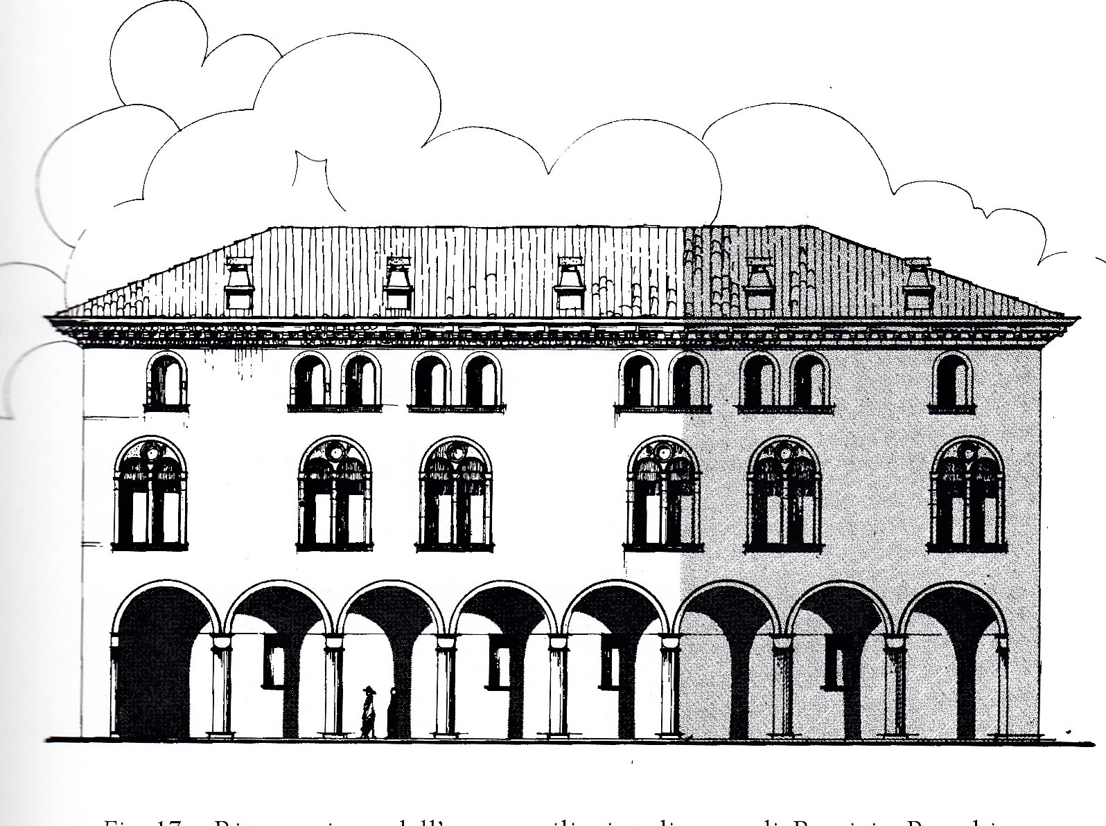 Il recupero ideale dell’aspetto originale del Palazzo, che qui si vede in una delle sue riproduzioni più antiche, non può dirsi del tutto raggiunto perché non risulta chiaramente definibile la fisonomia originaria dell’anconetta nella quale dovette essere stata accolta per lunghissimo tempo la statua della Vergine che ora si trova sul timpano dell’Oratorio della Madonnina.