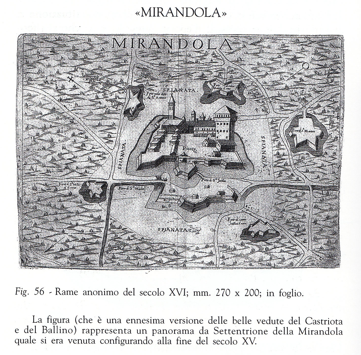 Anche in una opera tedesca del secolo XVI che racconta tra l’altro la guerra di Carlo V e di Papa Giulio III contro alla Mirandola si leggono pressapoco le stesse cose: «… Pochi anni or sono … furono demolite le mura e colmati i fossati che separavano la località detta Castro Novo dalla località detta la Cittadella, così ai nostri giorni aggiungendo a forma e conformazione estensione ed ampiezza ne è sorta una magnifica e grande città…», (S. Munster, Cosmographia universalis, libro II, cap. XXXV: Die Statt Mirandula, Basilea 1554, pp. 278-79).