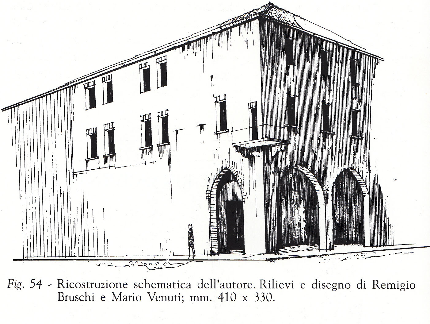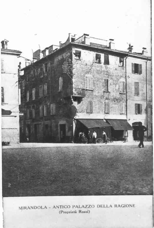 Eccetto che la chiesa di S. Francesco (rifatta nell’anno 1400) e la Casa della Ragione (entrambe situate nella parte dell’antica Mirandola detta il Borgo di Sopra) nulla rimane ora della Mirandola medioevale. Le case, fuori di ogni possibile classificazione, che per trovarsi in questa parte della Città sono da considerarsi in gran parte risalenti al trecento sono state inghiottite dal tempo cioè dai rifacimenti. La planimetria medioevale della quale rimangono le tracce solo nel Borgo Bruciato è stata alterata o distrutta dal piano riordinatore del secolo XVI.