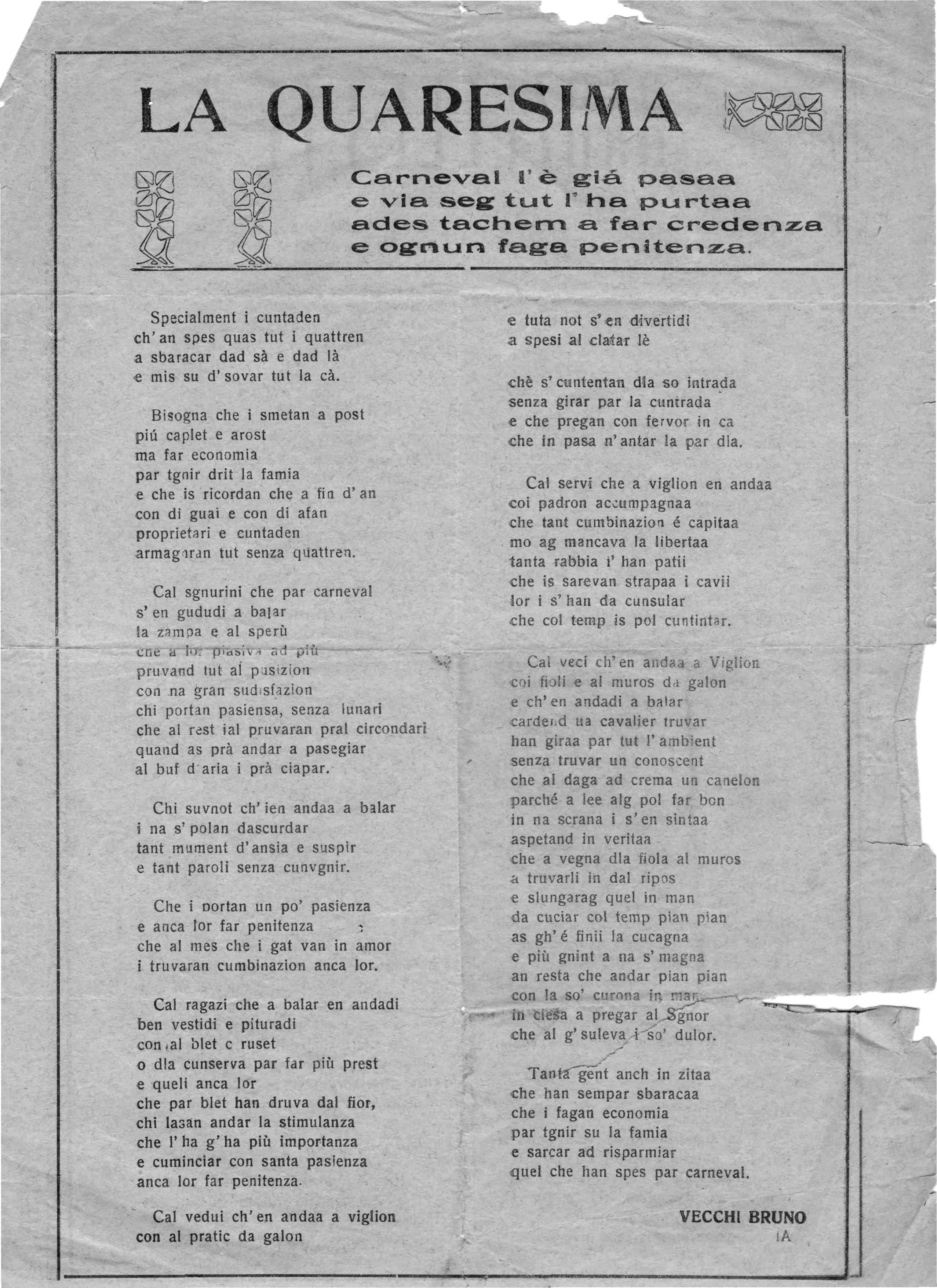Inizia con queste parlole il seguito dell’altra zirudella “L’ultim gioran ad carneval”. “Al Bel Bruno” richiama i contadini, le signorine, i giovanotti, le vedove ecc.ecc., dopo i giorni delle feste e dei bagordi, ad una vita più parsimoniosa.