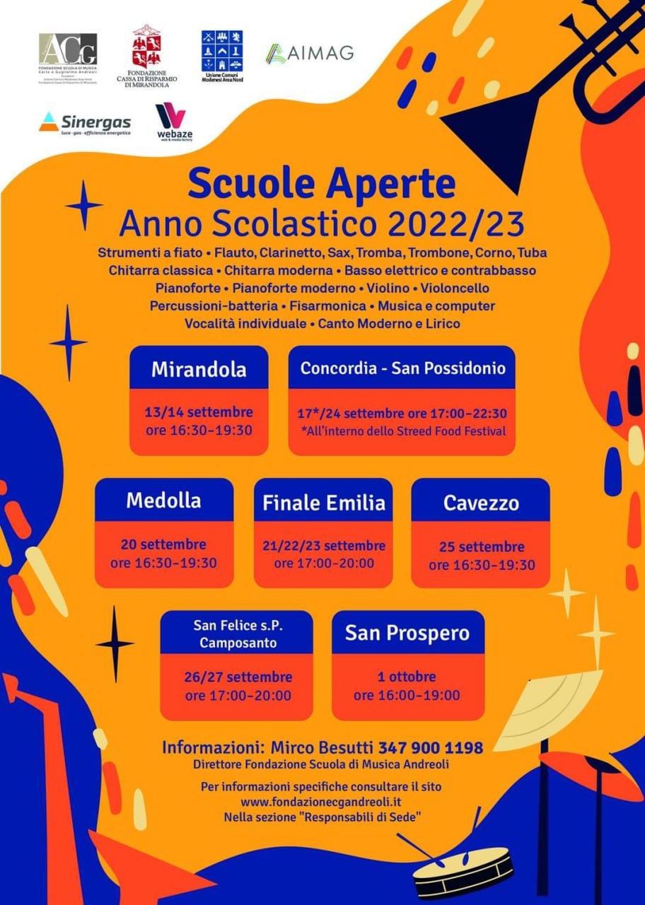 Gli open day si rivolgono a tutte le persone interessate ad intraprendere un percorso di formazione musicale dagli 8 anni in avanti, mentre per i bambini più piccoli sono definiti percorsi collettivi di “Propedeutica musicale” (per ragazzi nei primi due anni della scuola primaria), “Musica e movimento” (per bambini da 3 a 5 anni, riunione Informativa: Lunedì 19 settembre 2022 ore 18.30 Mirandola, sede Scuola di Musica via Fermi n.3 Martedì 20 settembre 2022 ore 18.30 Finale Emilia, sede Scuola di Musica via Montegrappa n.3 per informazioni 392 8358769) e “Primi passi in musica” (per bimbi da 0 a 36 mesi riunione informativa Giovedì 22 settembre 2022 ore 18,30 – Mirandola, Sede Scuola di Musica – Via Fermi n.3 Per informazioni 392 8358769 Claudia).