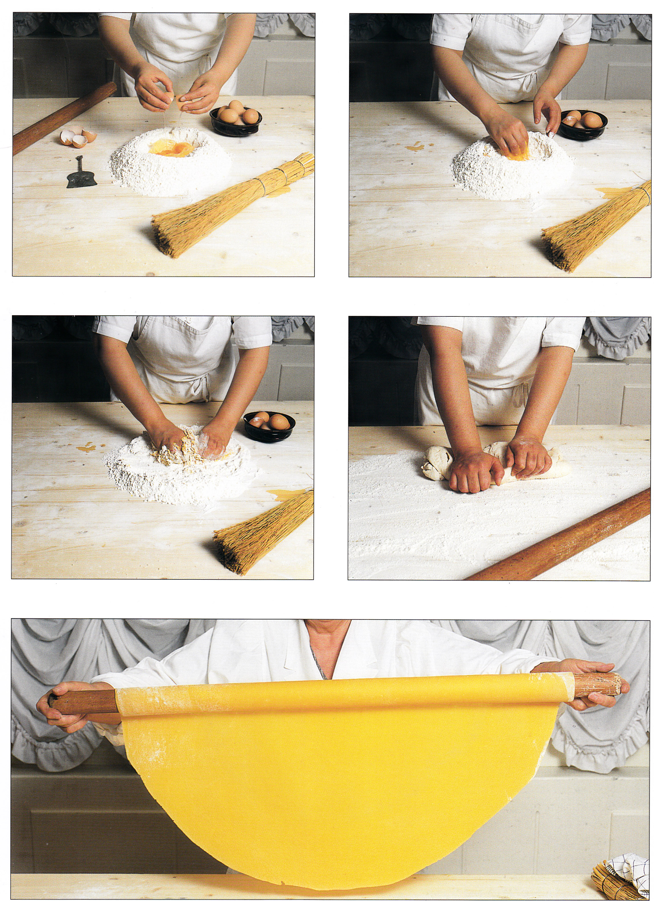 Se si vuole ottenere una pasta intensamente gialla, che tenga la cottura, invece dell’uovo per ogni 100 gr. di farina, si devono incorporare due tuorli. Oltre alla consistenza, la sfoglia ne guadagnerà anche in un più deciso e gradevole sapore.