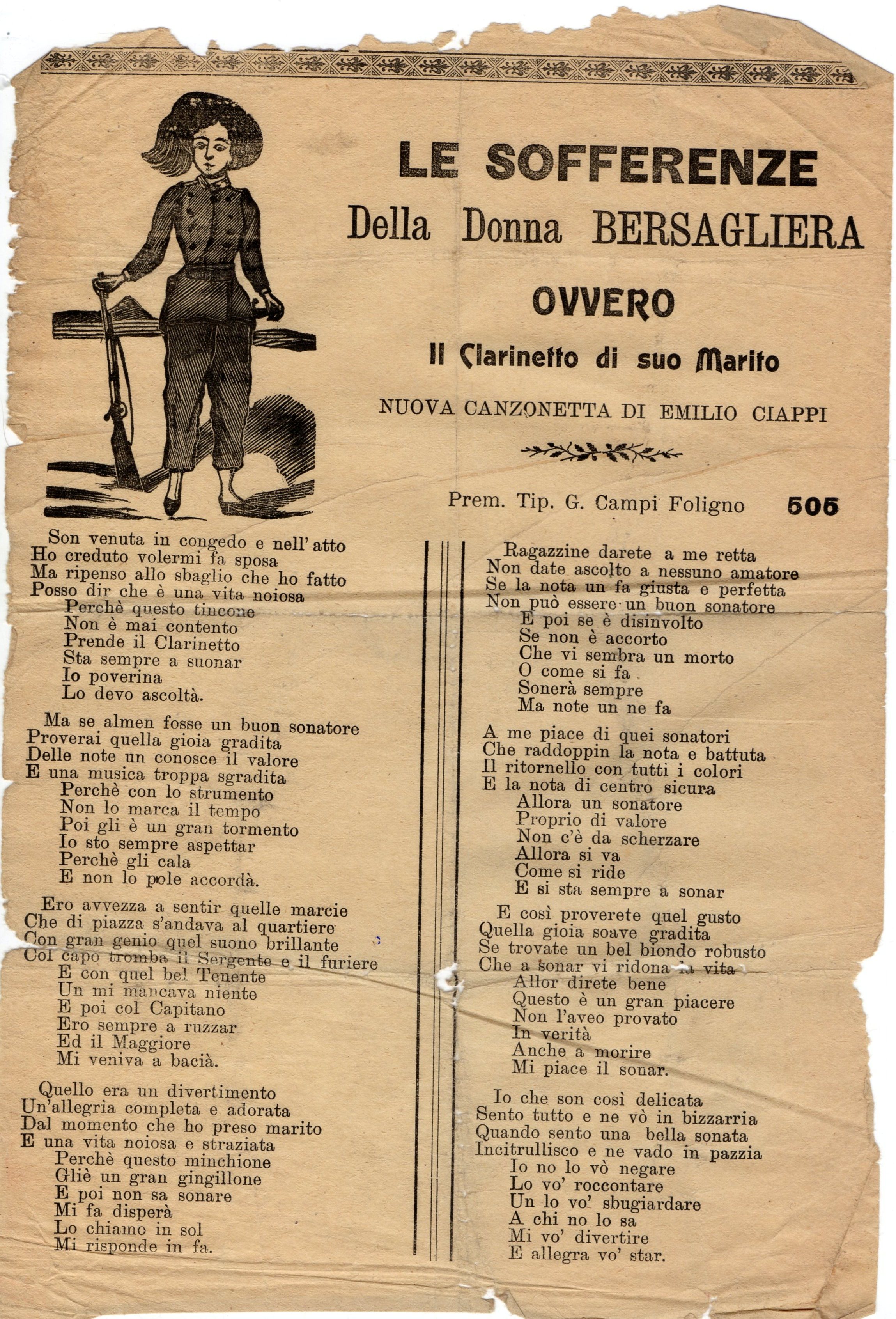 Povera “Donna Bersagliera”! Congedatasi si sposa ma subito si pente. “Perchè questo tincone non è mai contento, prende il Clarinetto, sta sempre a suonar. Io, poverina, lo devo ascoltà.