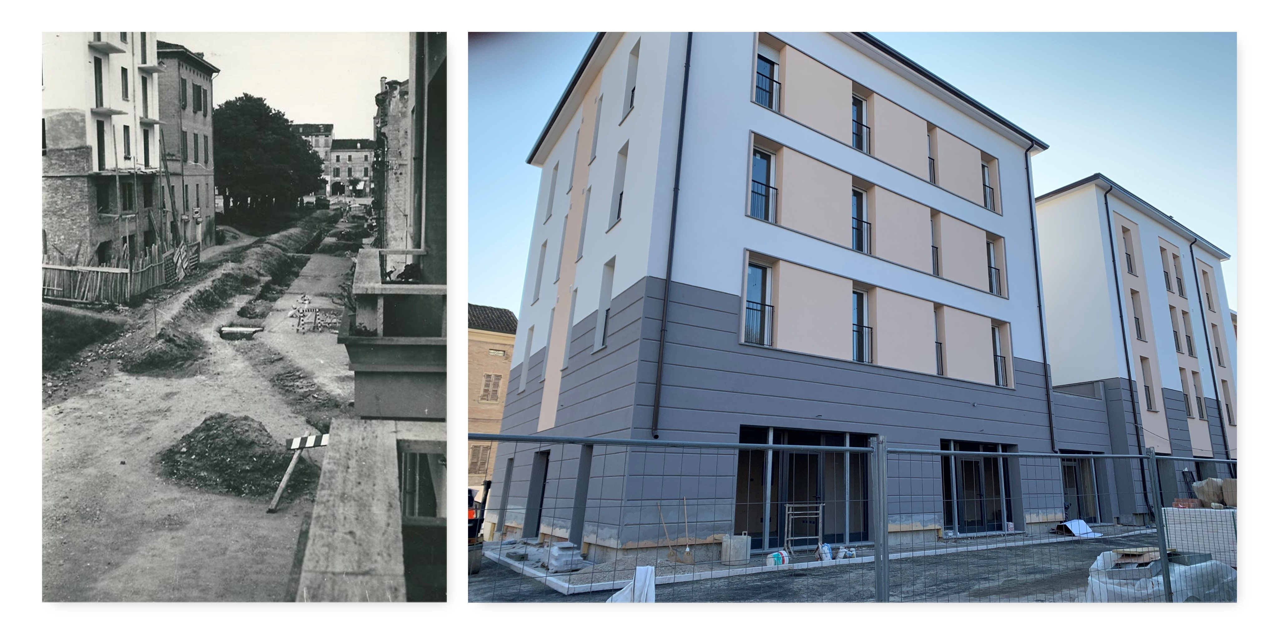 I due condomini visti da via Tabacchi in una immagine del 1956 durante i lavori di fognatura - Nella seconda invece, gli stessi condomini visti da Piazza Marconi dopo il lavoro di rifacimento a seguito dei danni causati dal sisma del 2012.