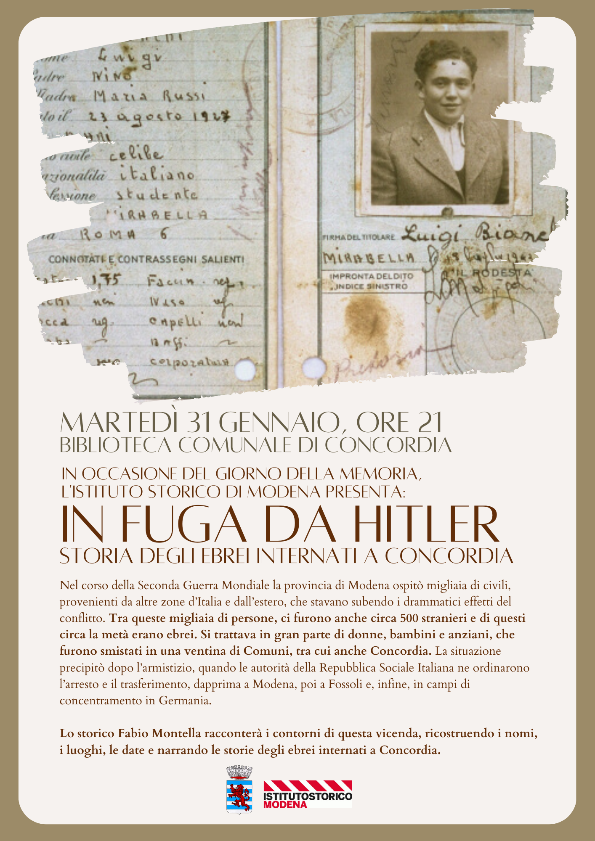 Il Comune di Concordia celebra il Giorno della Memoria martedì 31 Gennaio 2023 alle ore 21 presso la Biblioteca comunale con la presentazione da parte dello storico Fabio Montella di una ricerca dedicata alla storia degli ebrei internati nel territorio della Bassa modenese tra il 1942 e il 1945. L’iniziativa è realizzata in collaborazione con l’Istituto storico di Modena.