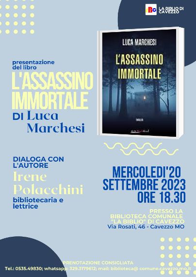 Mercoledì 20 settembre alle ore 18.30, Luca Marchesi presenterà il suo nuovo romanzo “L’assassino immortale” presso la biblioteca comunale di Cavezzo (MO), situata in via Rosati 46.