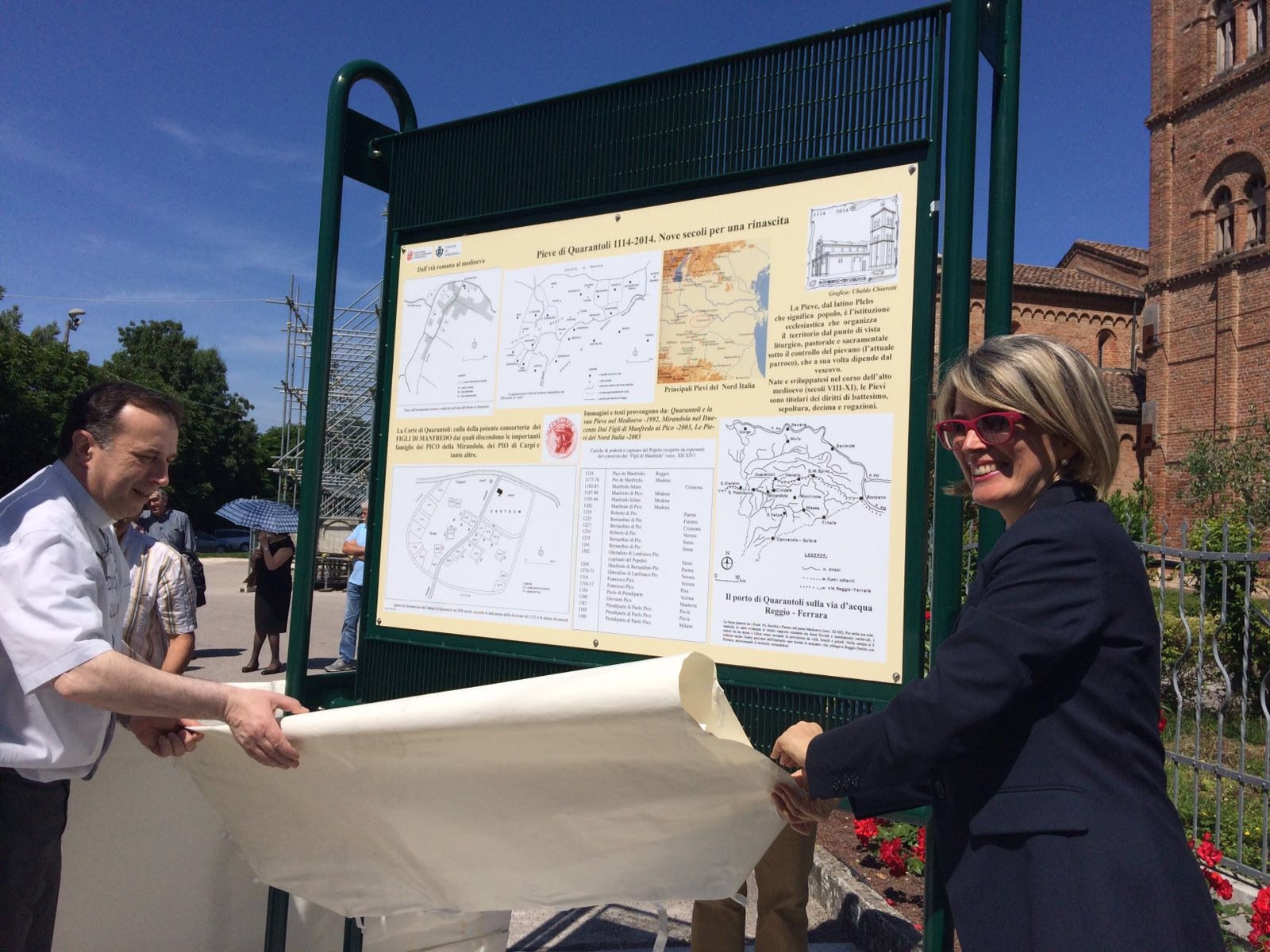 I pannelli, realizzati in occasione della presentazione del libro “Pieve di Quarantoli, 1114-2014. Nove secoli per una rinascita” (dedicato al professor Bruno Andreolli), sono stati pensati per lasciare al paese in forma tangibile un ricordo del novecentenario della sua nascita e per riassumere in forma sintetica la straordinaria importanza di Quarantoli sin dall’epoca romana.