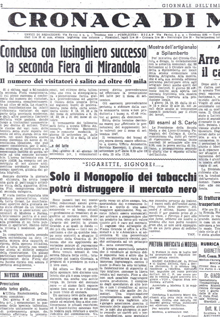 Il GIORNALE DELL’EMILIA ROMAGNA, nella “Cronaca di Modena” il 9 settembre 1947 conclama: “Conclusa con lusinghiero successo la seconda Fiera di Mirandola.