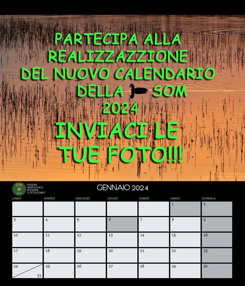 Visto il successo degli anni passati anche per il 2024 l’idea sarebbe di realizzare un calendario a tema, e dare così continuità alla collezione di calendari che andrà via via completandosi nel corso degli anni. Dopo diversi calendari in cui abbiamo trattato singoli gruppi di uccelli, con il prossimo calendario vorremmo dare importanza sì agli uccelli del territorio, ma anche e soprattutto agli ambienti che li ospitano, mettendo in risalto l’importanza che hanno questi ultimi per la conservazione delle specie e della biodiversità in generale. In particolare quest’anno ci vorremmo focalizzare sull’oasi che ospita la SOM, per darne maggiore risalto e importanza.
