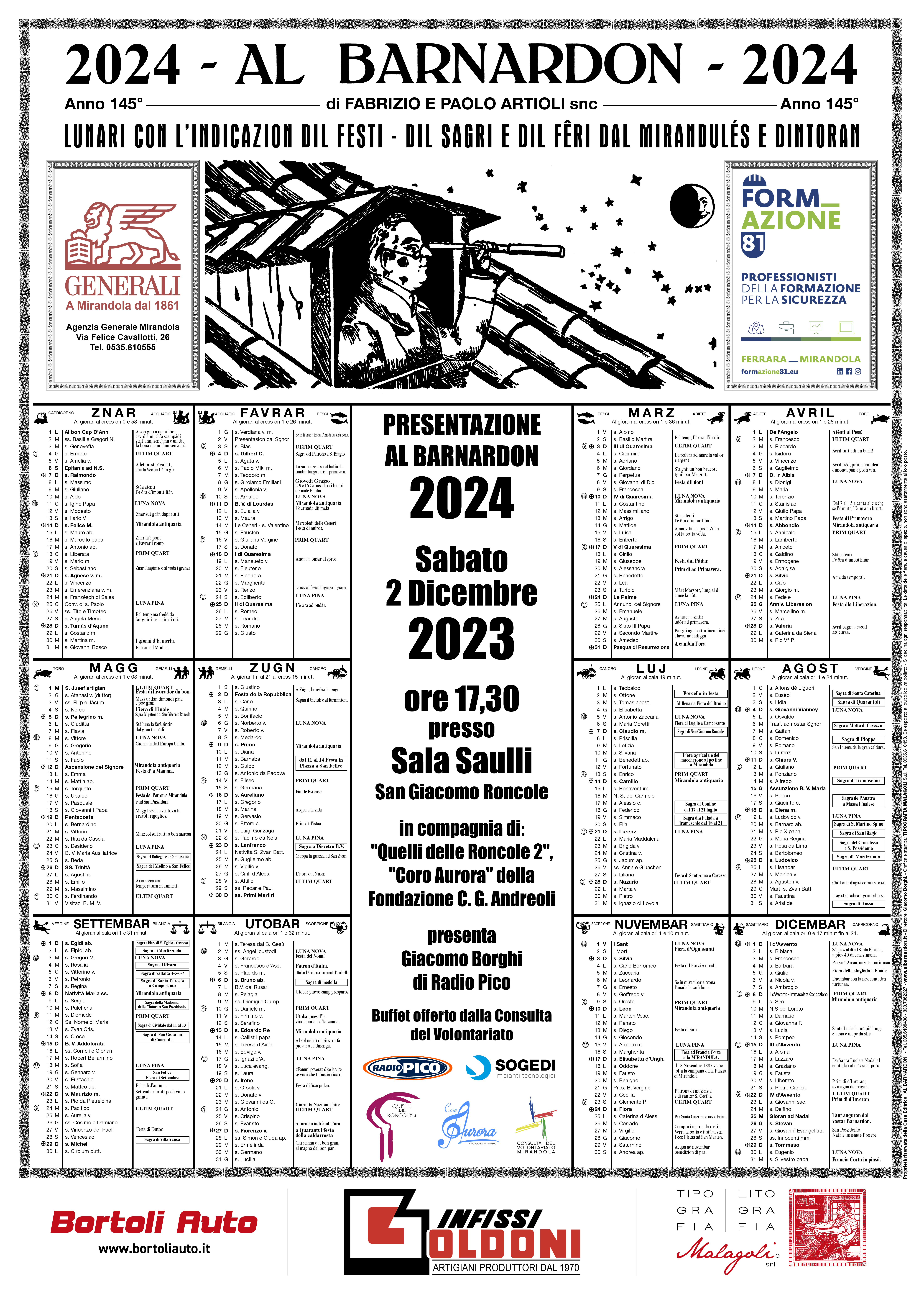Anche quest’anno presenteremo “Al Barnardon 2024”. Il 145° anno sarà di svolta per noi, alcune importanti aziende mirandolesi ci supporterammo economicamente in questo nostro sforzo per mantenere alta l’attenzione sulle nostre tradizioni e sul nostro dialetto. Avremo importanti novità che verrano svelate nel mese di dicembre, una tra queste, il sito del Barnardon (www.albarnardon.it) rinnovato e reso più compatibile alle applicazioni multimediali più moderne.