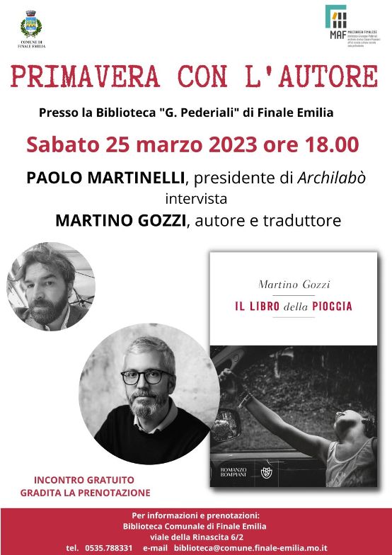 Nell’ambito dell’iniziativa “Primavera con l’autore”, sabato 25 marzo 2023 alle ore 18.00, la Biblioteca “G. Pederiali” di Finale Emilia, ospiterà lo scrittore e traduttore Martino Gozzi, che sarà intervistato da Paolo Martinelli, presidente di Archilabò.
