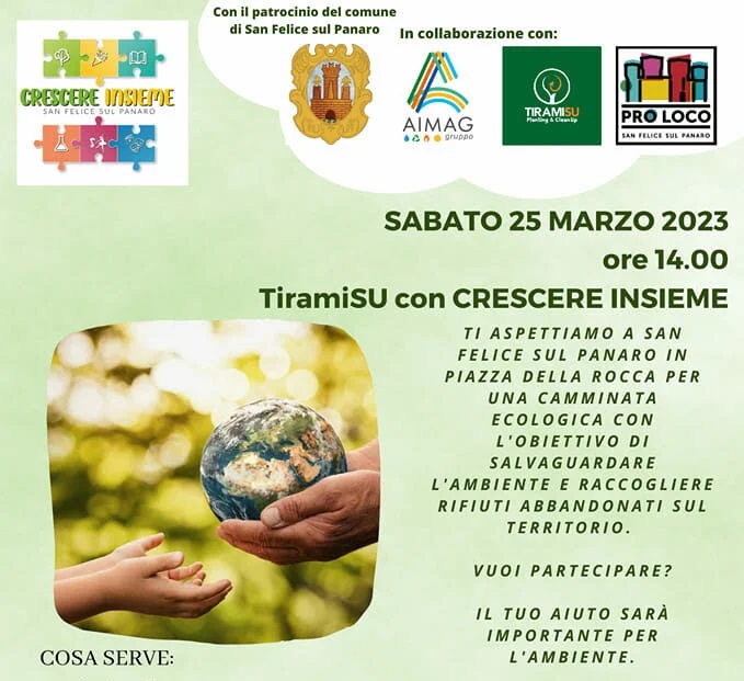Sabato 25 marzo a San Felice sul Panaro, con partenza alle 14 da piazza della Rocca, si svolgerà “Tiramisu con Crescere Insieme”, camminata ecologica per le vie e i parchi del paese con l’obiettivo di salvaguardare l’ambiente e raccogliere rifiuti abbandonati nel territorio.
