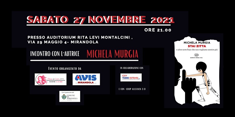 La serata, che gode del sostegno e il contributo di Coop.Alleanza 3.0 e CSV Terre estensi e del patrocinio del Comune di Mirandola, è ad ingresso gratuito fino ad esaurimento dei posti disponibili con prenotazione obbligatoria al link https://www.eventbrite.com/e/biglietti-incontro-con-lautrice-michela-murgia-202578948087