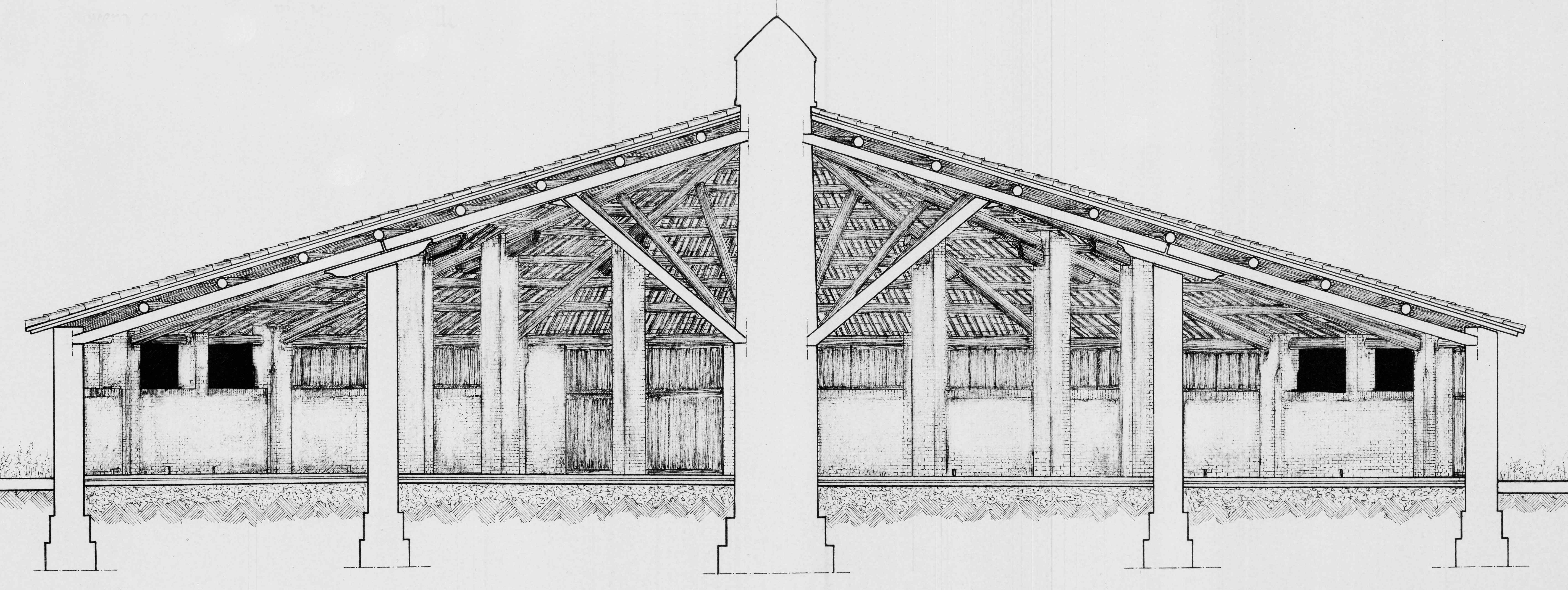 La struttura degli altri cinque barchessoni è più semplice, è caratterizzata da una colonna centrale, (Foto 5) nella quale sono incastrati a raggiera 16 elementi inclinati di legno (saettoni) che sostengono altrettanti puntoni disposti secondo le linee di falda.