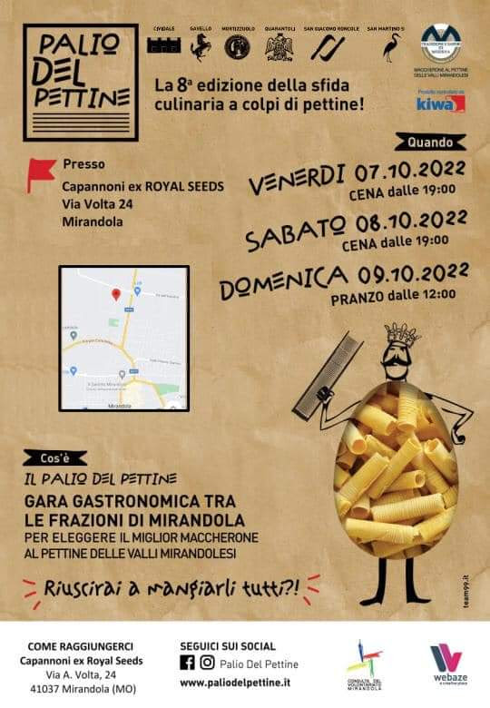 Sarà una giuria di giornalisti enogastronomici, chef e consumati gourmet a valutare il “Vero Maccherone al Pettine delle Valli Mirandolesi”, come noto di forma cilindrica e privo delle due punte estreme (caratteristiche invece proprie del Garganello romagnolo), il quale rappresenta il più recente prodotto tipico a fregiarsi del prestigioso marchio ‘Tradizione e Sapori di Modena’, ma anche la giuria popolare esprimerà un altrettanto autorevole parere, per proclamare infine il miglior maccherone al Pettine della Bassa 2022