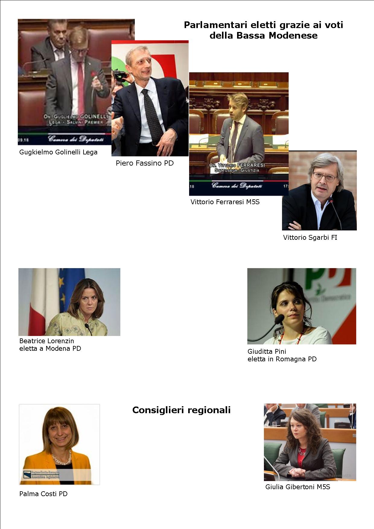 Il deputato Guglielmo Golinelli- Lega -è stato rieletto anche consigliere comunale e conosce bene i nostri problemi relativi a Sanità e Viabilità, come Vittorio Ferraresi-M5S, Piero Fassino-PD pur eletto nel nostro territorio, non è direttamente legato ad esso, ma ha sempre dimostrato nella sua vita politica una buona capacità di ascoltare e di agire in conseguenza di ciò; anche Vittorio Sgarbi-FI, pur senza conoscerci è parlamentare grazie al paracadute della Bassa. Giuditta Pini-PD originaria di S.Felice anche se eletta in Romagna, conosce bene i nostri problemi, Beatrice Lorenzin-PD, eletta a Modena, non conosce il nostro territorio, ma sarebbe utile coinvolgerla per discutere con lei di Sanità e accessibilità ai servizi sanitari in relazione anche alla sua riforma del 2015. Infine abbiamo le consigliere regionali Palma Costi-PD ex presidente Cons. R.E.R. e Giulia Gibertoni-M5S, ambedue profonde conoscitrici dei problemi del nostro territorio.