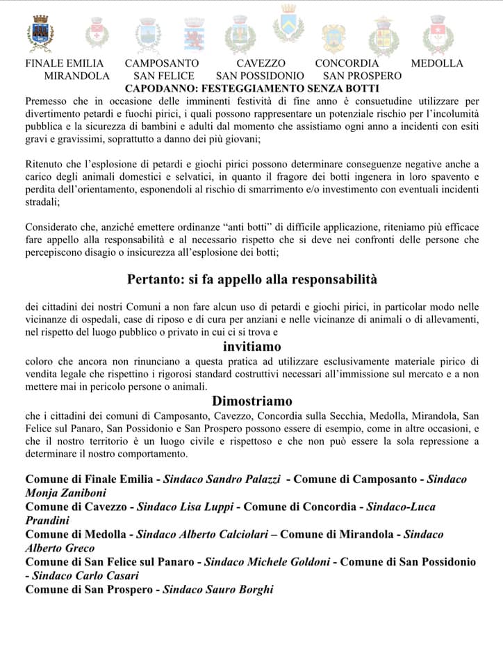 Quindi, cittadini della Bassa, se abbiamo a cuore la salute dei nostri animali domestici e non, distinguiamoci per senso civico, i fuochi d’artificio o “botti” lasciamoli nei negozi.
