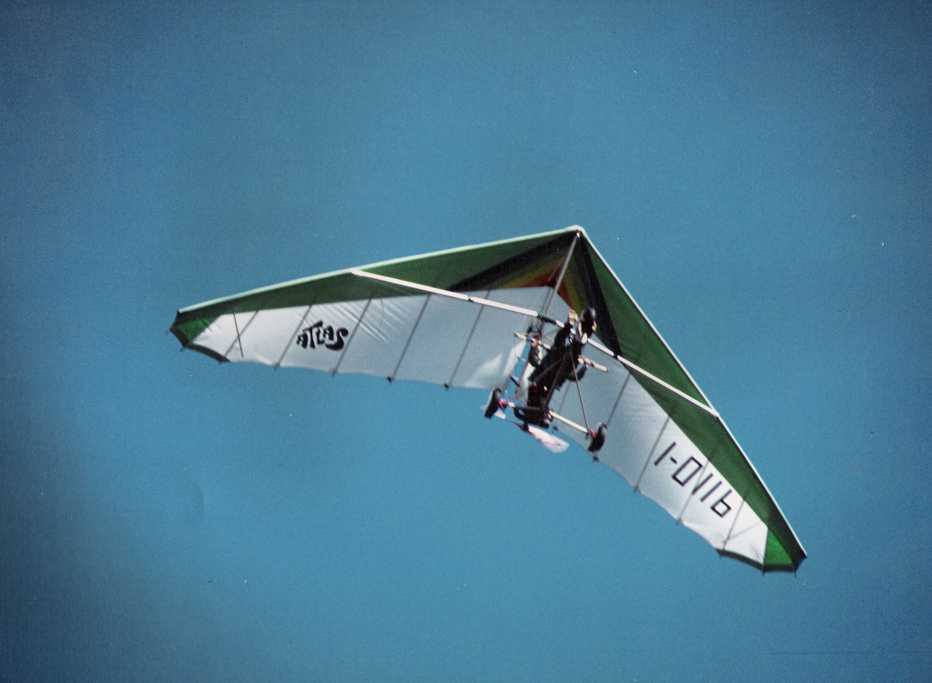 Una volta tornato a casa, iniziai le ricerche sfogliando le riviste di aeronautica e dopo parecchio tempo trovai finalmente ciò che cercavo: l’ala di Rogallo. Trattasi di una interessante trovata da parte di un ingegnere italiano che lavorava per la NASA. Era in pratica un grosso aquilone di forma triangolare o a delta che avrebbe dovuto permettere alle astronavi americane di planare nell’atmosfera e di atterrare finalmente sulla terraferma. Dopo alcune prove l’idea venne scartata ed il progetto finì nel dimenticatoio. Qualcuno doveva aver rispolverato l’idea ed averla applicata al volo a vela ricavandone un nuovo tipo di aliante molto leggero , maneggevole ed economico. Qualcun’altro l’aveva poi ampliata aggiungendo una specie di piccolo triciclo in tubi ed un motorino azionante una piccola elica; era nato il deltaplano a motore e quando lo avvistai la prima volta, la sua diffusione in Italia ed in particolare nell’Emilia era già a buon punto. Per la verità, a parte la curiosità iniziale per la novità, non ci feci caso più di tanto, ma il tempo passava e questi aggeggi erano sempre più numerosi e frequentavano i cieli di Mirandola e dintorni sempre più insistentemente.