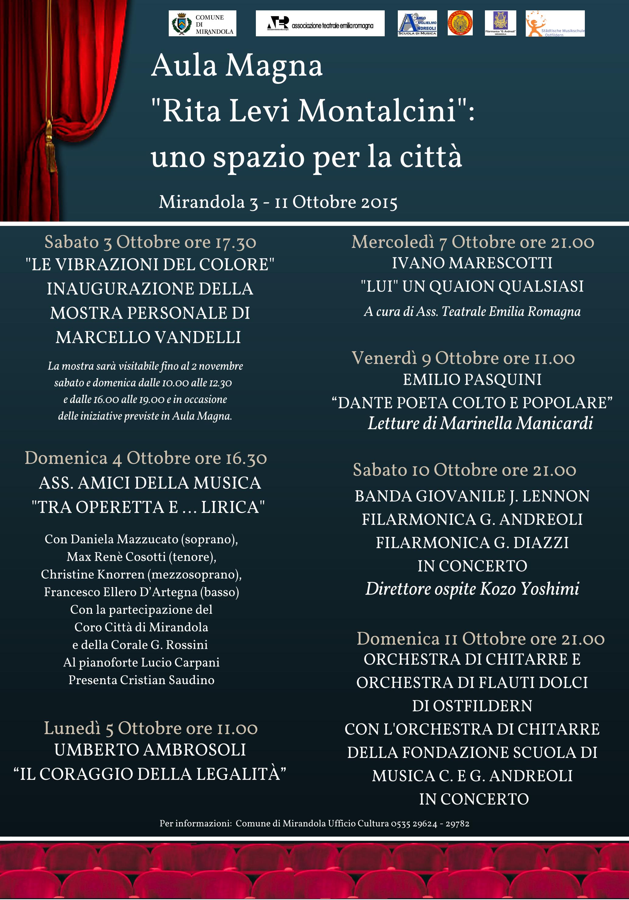 Il primo evento si terrà sabato 3 alle 17,30 con “Le vibrazioni del colore”, l’inaugurazione della mostra personale di Marcello Vandelli. Sarà possibile visitare l’esposizione fino al 2 novembre, sabato e domenica dalle 10 alle 12,30 e dalle 16 alle 19 e in occasione delle iniziative previste in Aula Magna. Domenica 4 alle 16,30 l’associazione Amici della musica organizza “Tra operetta e… lirica”, con la soprano Daniela Mazzucato, il tenore Max Renè Cosotti, la mezzosoprano Christine Knorren, il basso Francesco Ellero D’Artegna e con la partecipazione del Coro città di Mirandola e della Corale G. Rossini, con il pianoforte di Lucio Carpani. La serata sarà presentata da Cristian Saudino.