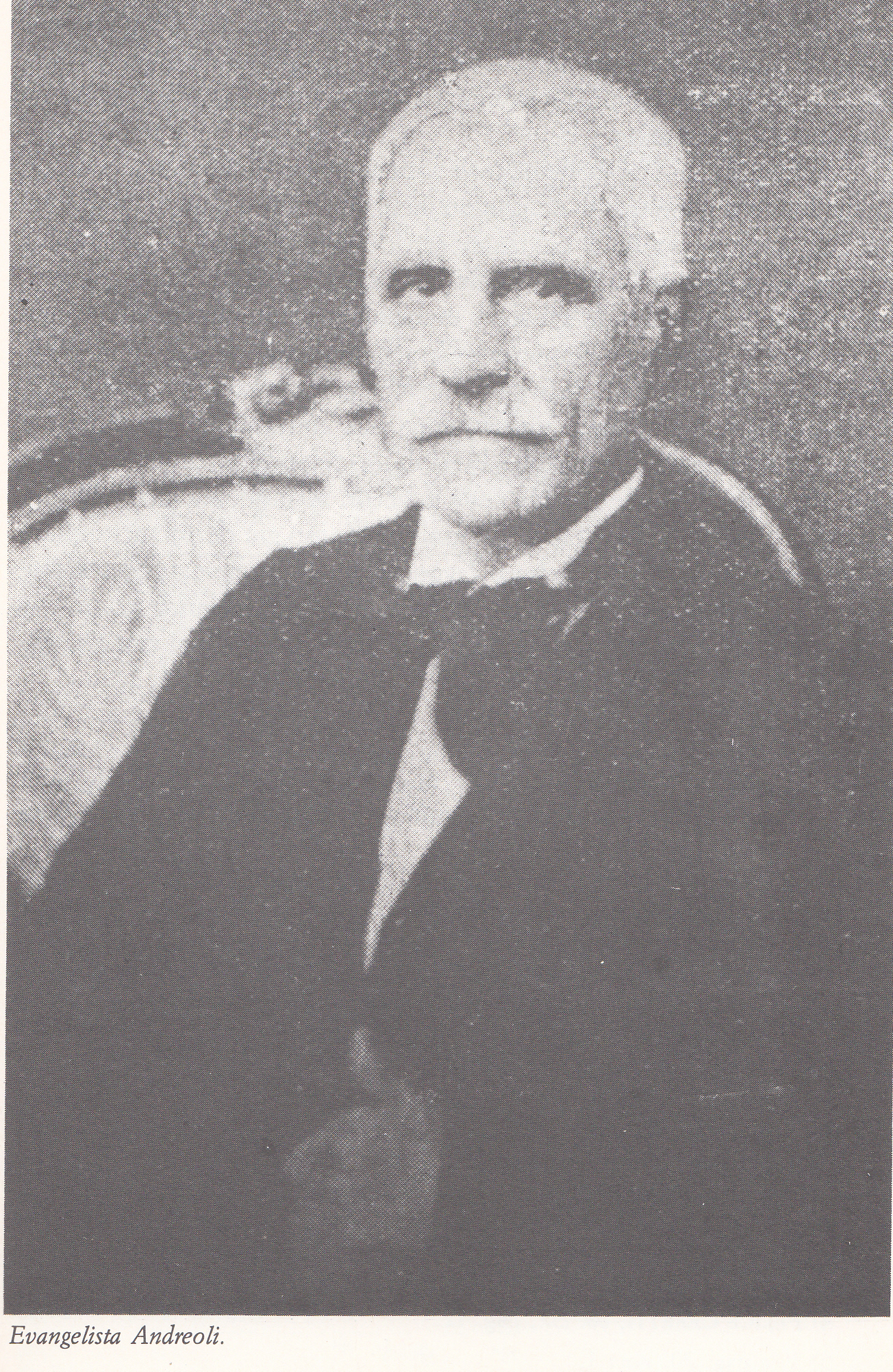 Il 27 gennaio del 1810 nasce a Disvetro Evangelista Andreoli da Pietro e Annunziata Porta. Pochi anni dopo la famiglia si trasferisce alla Mirandola prendendone la cittadinanza, grazie ad un diploma emesso da Rinaldo I duca di Modena nel 1737. Ancor giovane indossa l’abito clericale, ma ben presto si “ravvede” e se ne libera, interrompendo pure gli studi.