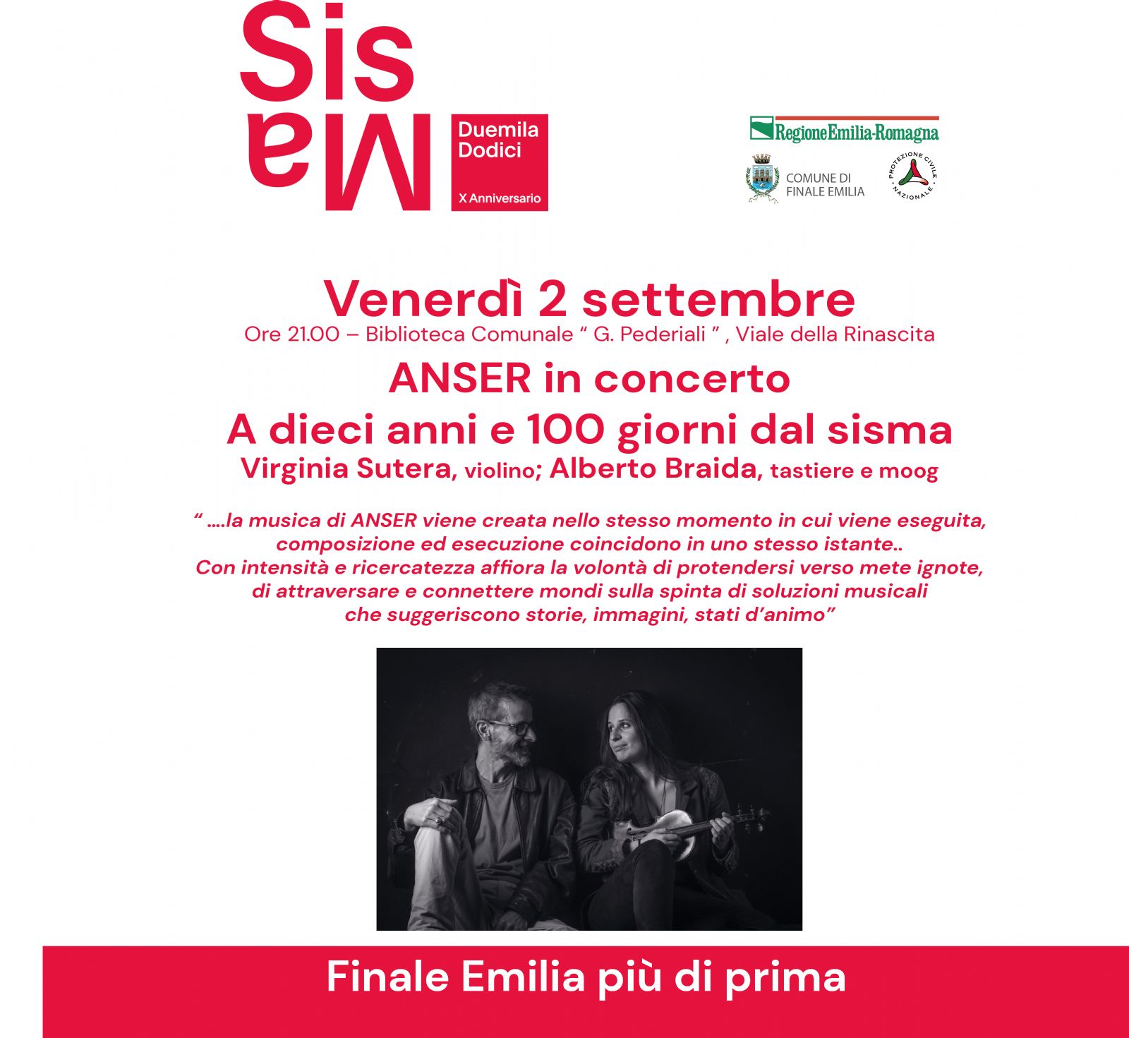 Nell’ambito delle iniziative “Finale più di prima. Sisma 2012. X Anniversario”, venerdì 2 settembre, alle ore 21.00, la Biblioteca Comunale G. Pederiali ospiterà il concerto che il duo musicale Anser – formato da Virginia Sutera, violino, e Alberto Braida, tastiere e moog – ha voluto donare alla nostra comunità 10 anni e 100 giorni dopo il terremoto che ha colpito la bassa modenese.
