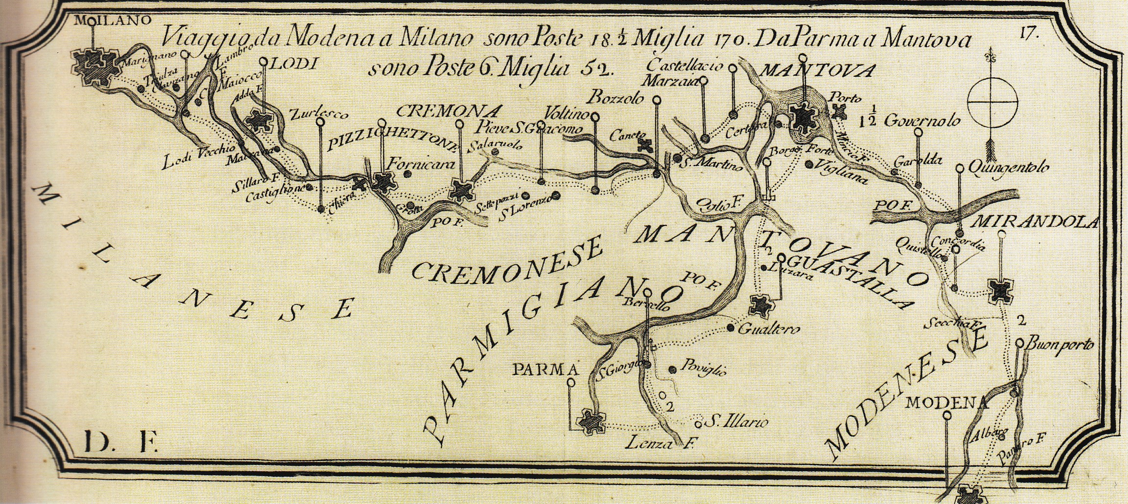 Indica le tappe postali nel tratto stradale tra Modena e Milano e, con diverse altre, la Stazione di Posta della Mirandola, toccata direttamente dalla strada nel tratto Milano-Modena che passa per Mantova. Totale del percorso, 170 miglia. Altra importante tratta messa in evidenza è il percorso Mantova-Parma (52 miglia).