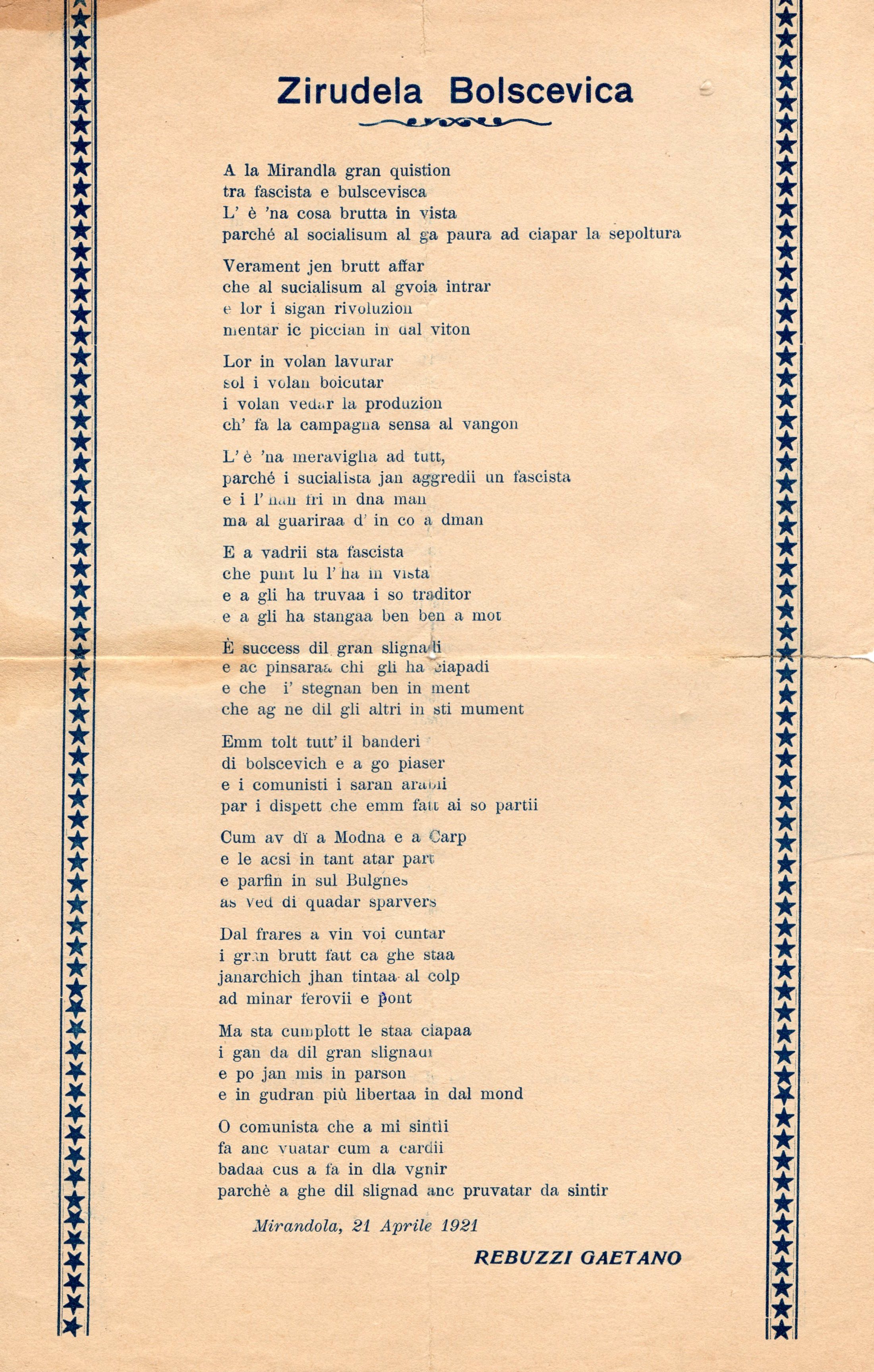 Il cantastorie Gaetano Rebuzzi se la prende con i socialisti, con i comunisti e con gli anarchici. Neanche il 1921 è un anno tranquillo a Mirandola !