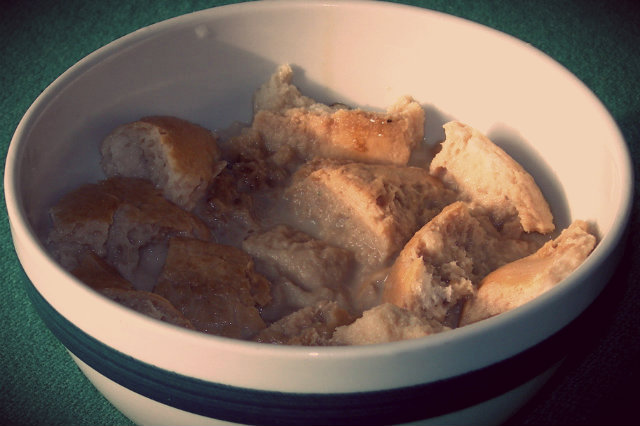 Zuppa di pane vecchio con caffelatte e zucchero.
